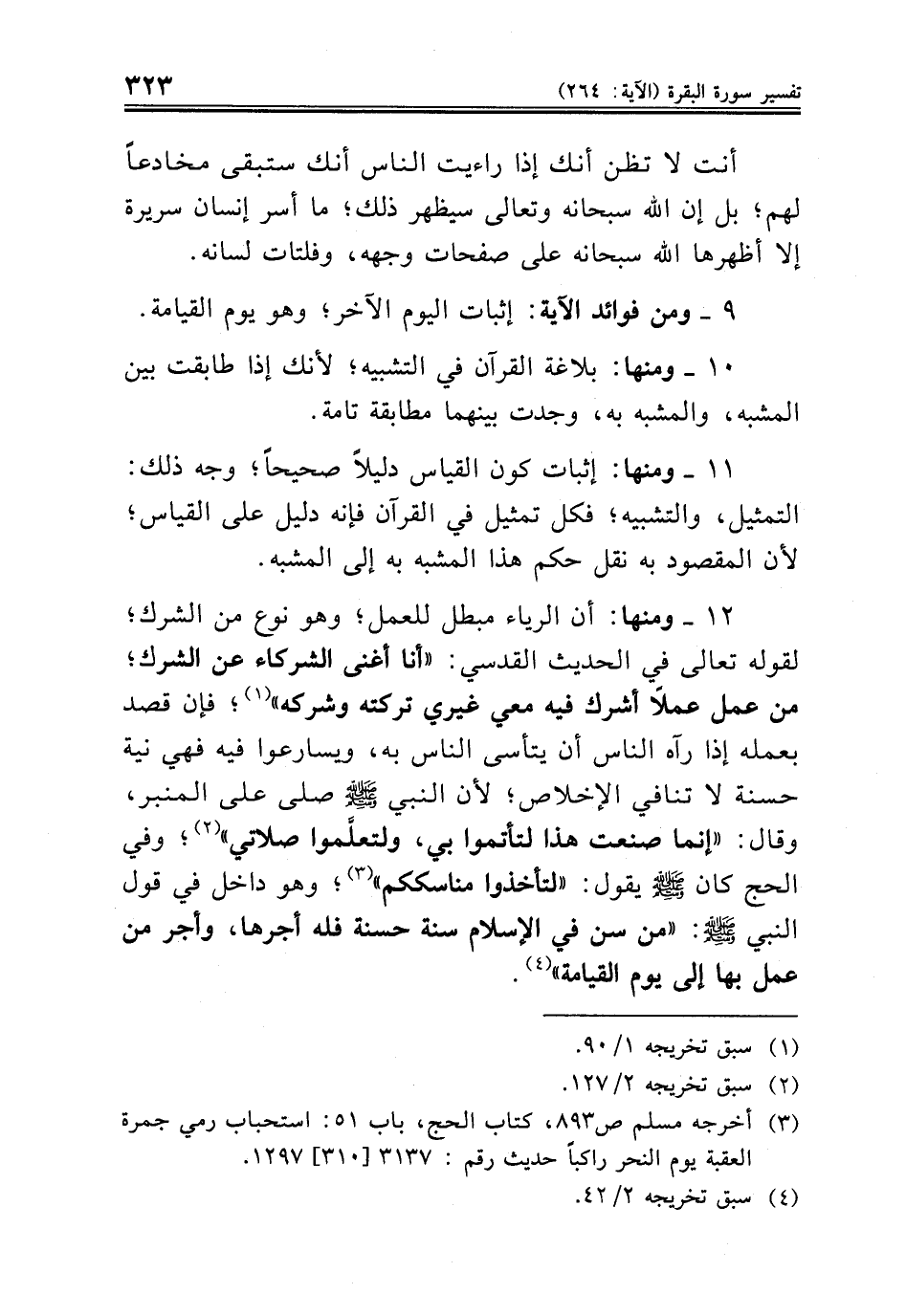 ١٢ - ومنها: أن الرياء مبطل للعمل؛ وهو نوع من الشرك؛ لقوله تعالى في الحديث القدسي: «أنا أغنى الشركاء عن الشرك؛ من عمل عملًا أشرك فيه معي غيري تركته وشركه» (¬١)؛ فإن قصد بعمله إذا رآه الناس أن يتأسى الناس به، ويسارعوا فيه فهي نية حسنة لا تنافي الإخلاص؛ لأن النبي صلى الله عليه وسلم صلى على المنبر، وقال: «إنما صنعت هذا لتأتموا بي، ولتعلَّموا صلاتي» (¬٢)؛ وفي الحج كان صلى الله عليه وسلم يقول: «لتأخذوا مناسككم» (¬٣)؛ وهو داخل في قول النبي صلى الله عليه وسلم: «من سن في الإسلام سنة حسنة فله أجرها، وأجر من عمل بها إلى يوم القيامة» (¬٤).