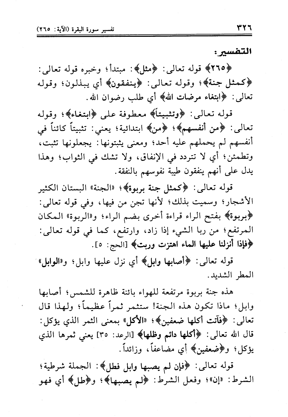 {٢٦٥} قوله تعالى: {مثل}: مبتدأ؛ وخبره قوله تعالى: {كمثل جنة}؛ وقوله تعالى: {ينفقون} أي يبذلون؛ وقوله تعالى: {ابتغاء مرضات الله} أي طلب رضوان الله.