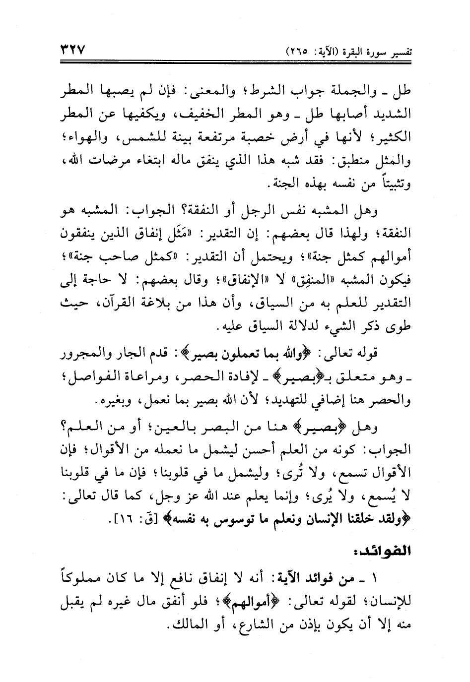طل - والجملة جواب الشرط؛ والمعنى: فإن لم يصبها المطر الشديد أصابها طل - وهو المطر الخفيف، ويكفيها عن المطر الكثير؛ لأنها في أرض خصبة مرتفعة بينة للشمس، والهواء؛ والمثل منطبق: فقد شبه هذا الذي ينفق ماله ابتغاء مرضات الله، وتثبيتاً من نفسه بهذه الجنة.