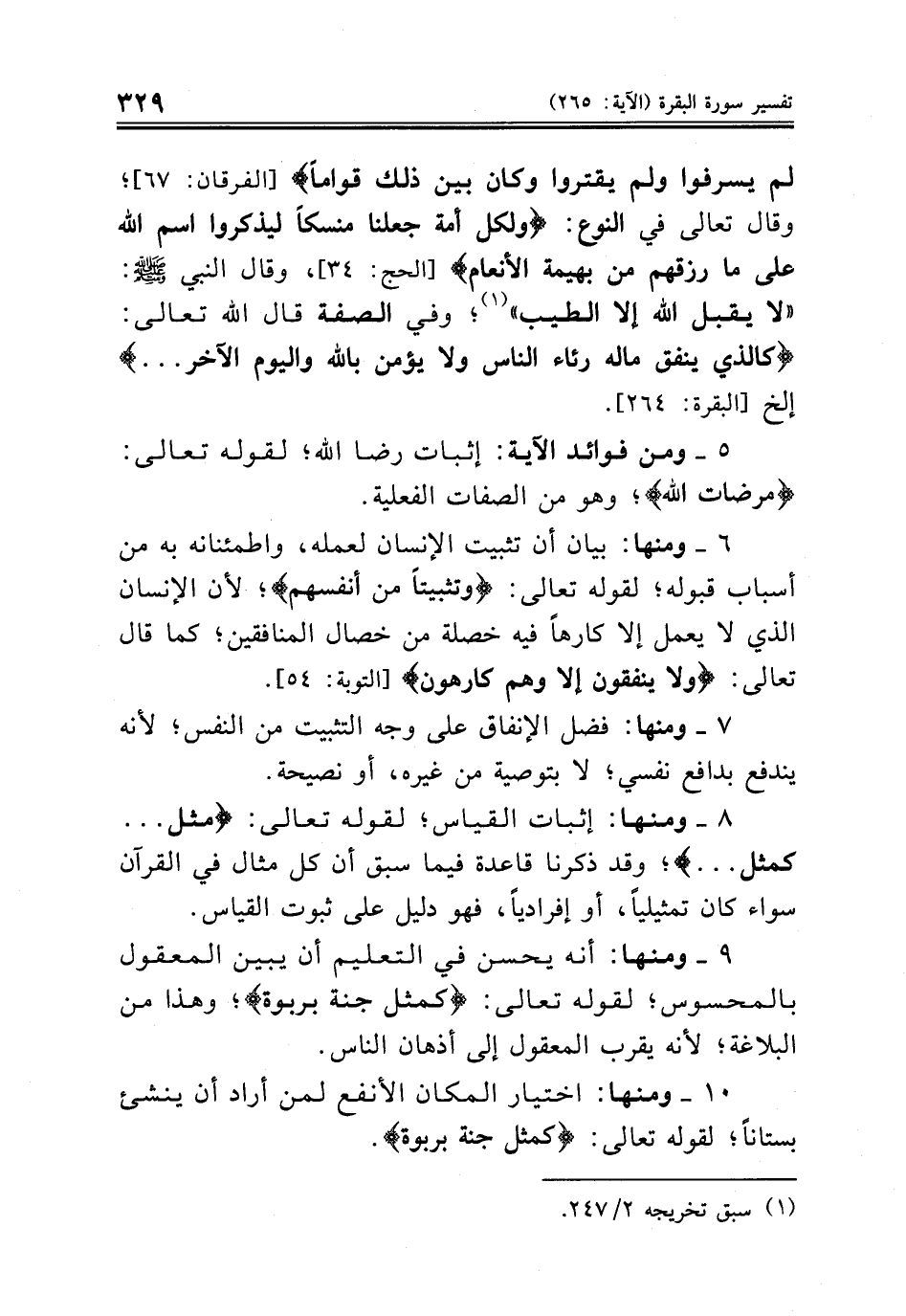 ٩ - ومنها: أنه يحسن في التعليم أن يبين المعقول بالمحسوس؛ لقوله تعالى: {كمثل جنة بربوة}؛ وهذا من البلاغة؛ لأنه يقرب المعقول إلى أذهان الناس.