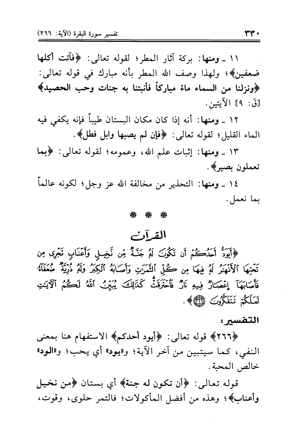 {٢٦٦} قوله تعالى: {أيود أحدكم} الاستفهام هنا بمعنى النفي، كما سيتبين من آخر الآية؛ و «يود» أي يحب؛ و «الود» خالص المحبة.