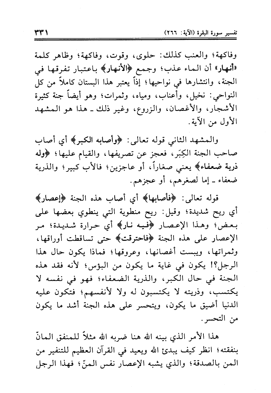 قوله تعالى: {فأصابها} أي أصاب هذه الجنة {إعصار} أي ريح شديدة؛ وقيل: ريح منطوية التي ينطوي بعضها على بعض؛ وهذا الإعصار {فيه نار} أي حرارة شديدة؛ مر الإعصار على هذه الجنة {فاحترقت} حتى تساقطت أوراقها، وثمراتها، ويبست أغصانها، وعروقها؛ فماذا يكون حال هذا الرجل؟! يكون في غاية ما يكون من البؤس؛ لأنه فقد هذه الجنة في حال الكبر، والذرية الضعفاء؛ فهو في نفسه لا يكتسب، وذريته لا يكتسبون له ولا لأنفسهم؛ فتكون عليه الدنيا أضيق ما يكون، ويتحسر على هذه الجنة أشد ما يكون من التحسر.