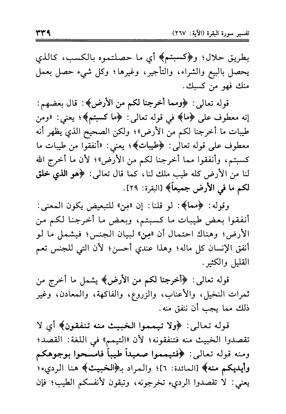 قوله تعالى: {ولا تيمموا الخبيث منه تنفقون} أي لا تقصدوا الخبيث منه فتنفقونه؛ لأن «التيمم» في اللغة: القصد؛ ومنه قوله تعالى: {فتيمموا صعيداً طيباً فامسحوا بوجوهكم وأيديكم منه} [المائدة: ٦]؛ والمراد بـ {الخبيث} هنا الرديء؛ يعني: لا تقصدوا الرديء تخرجونه، وتبقون لأنفسكم الطيب؛ فإن