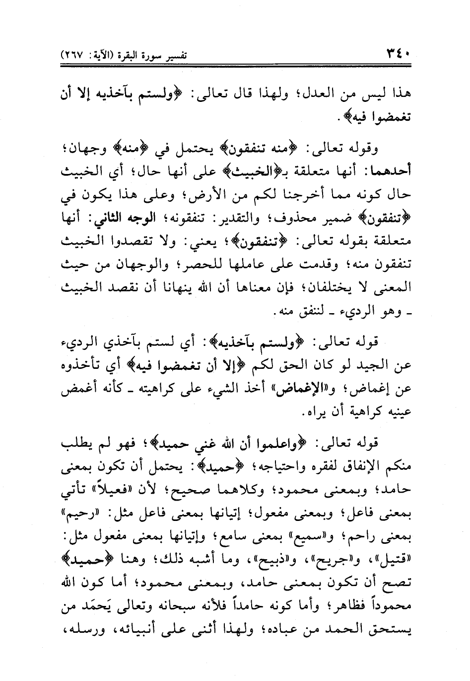 وقوله تعالى: {منه تنفقون} يحتمل في {منه} وجهان؛ أحدهما: أنها متعلقة بـ {الخبيث} على أنها حال؛ أي الخبيث حال كونه مما أخرجنا لكم من الأرض؛ وعلى هذا يكون في {تنفقون} ضمير محذوف؛ والتقدير: تنفقونه؛ الوجه الثاني: أنها متعلقة بقوله تعالى: {تنفقون}؛ يعني: ولا تقصدوا الخبيث تنفقون منه؛ وقدمت على عاملها للحصر؛ والوجهان من حيث المعنى لا يختلفان؛ فإن معناها أن الله ينهانا أن نقصد الخبيث - وهو الرديء - لننفق منه.