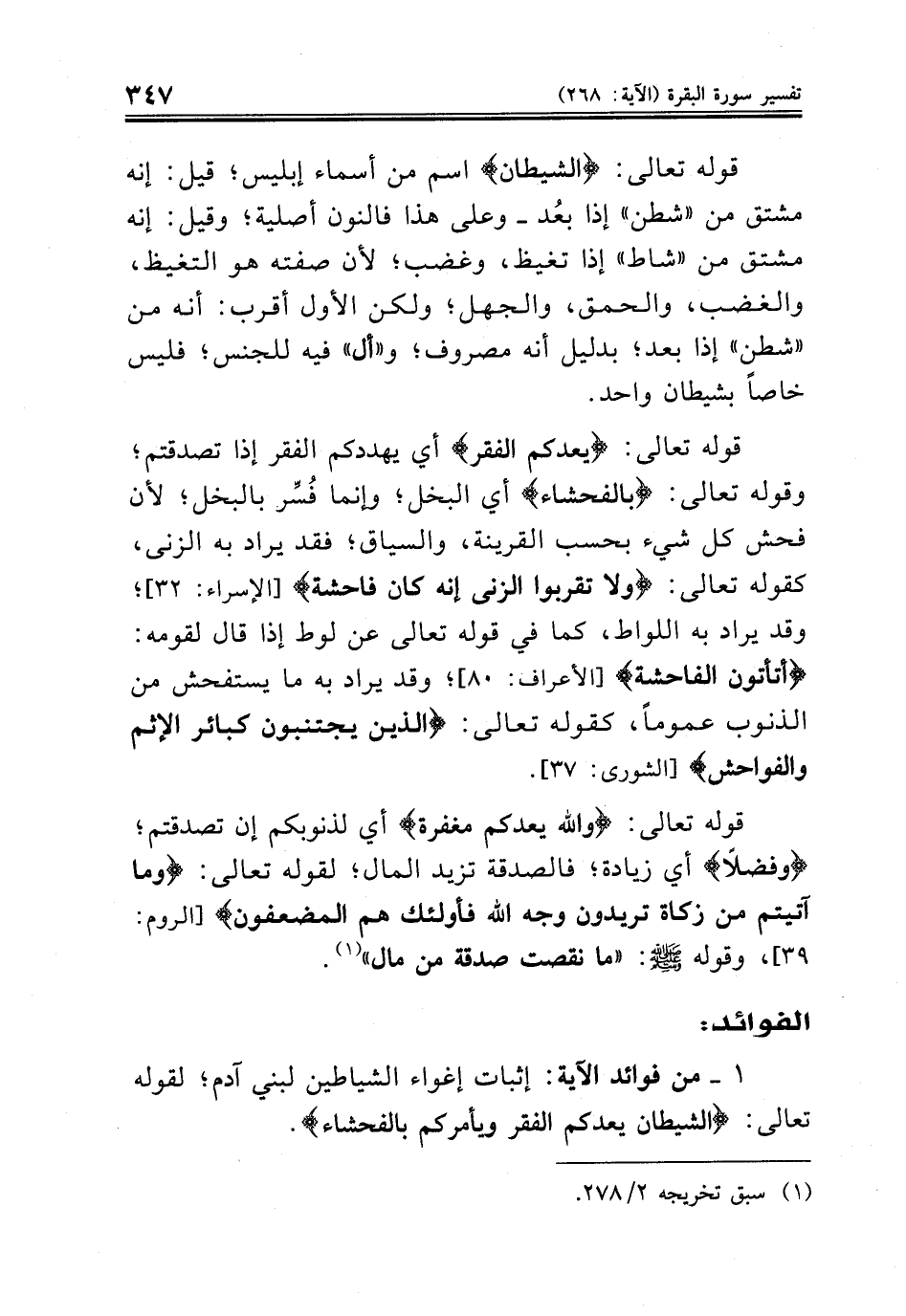 قوله تعالى: {يعدكم الفقر} أي يهددكم الفقر إذا تصدقتم؛ وقوله تعالى: {بالفحشاء} أي البخل؛ وإنما فُسِّر بالبخل؛ لأن فحش كل شيء بحسب القرينة، والسياق؛ فقد يراد به الزنى، كقوله تعالى: {ولا تقربوا الزنى إنه كان فاحشة} [الإسراء: ٣٢]؛ وقد يراد به اللواط، كما في قوله تعالى عن لوط إذا قال لقومه: {أتأتون الفاحشة} [الأعراف: ٨٠]؛ وقد يراد به ما يستفحش من الذنوب عموماً، كقوله تعالى: {الذين يجتنبون كبائر الإثم والفواحش} [الشورى: ٣٧].