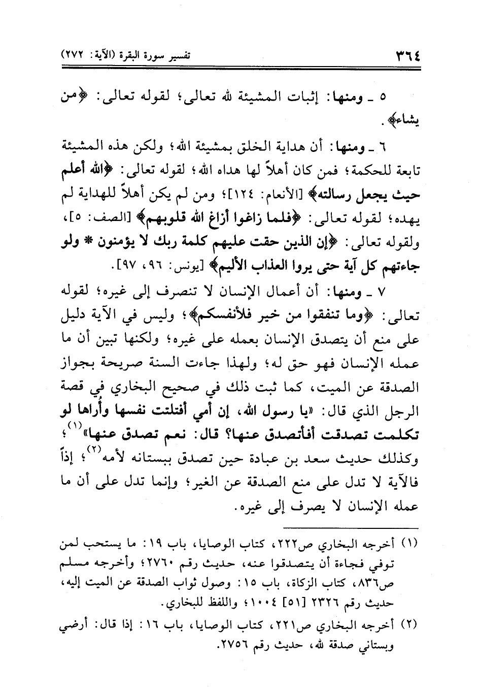 ٧ - ومنها: أن أعمال الإنسان لا تنصرف إلى غيره؛ لقوله تعالى: {وما تنفقوا من خير فلأنفسكم}؛ وليس في الآية دليل على منع أن يتصدق الإنسان بعمله على غيره؛ ولكنها تبين أن ما عمله الإنسان فهو حق له؛ ولهذا جاءت السنة صريحة بجواز الصدقة عن الميت، كما ثبت ذلك في صحيح البخاري في قصة الرجل الذي قال: «يا رسول الله، إن أمي أفتلتت نفسها وأُراها لو تكلمت تصدقت أفأتصدق عنها؟ قال: نعم تصدق عنها» (¬١)؛ وكذلك حديث سعد بن عبادة حين تصدق ببستانه لأمه (¬٢)؛ إذاً فالآية لا تدل على منع الصدقة عن الغير؛ وإنما تدل على أن ما عمله الإنسان لا يصرف إلى غيره.