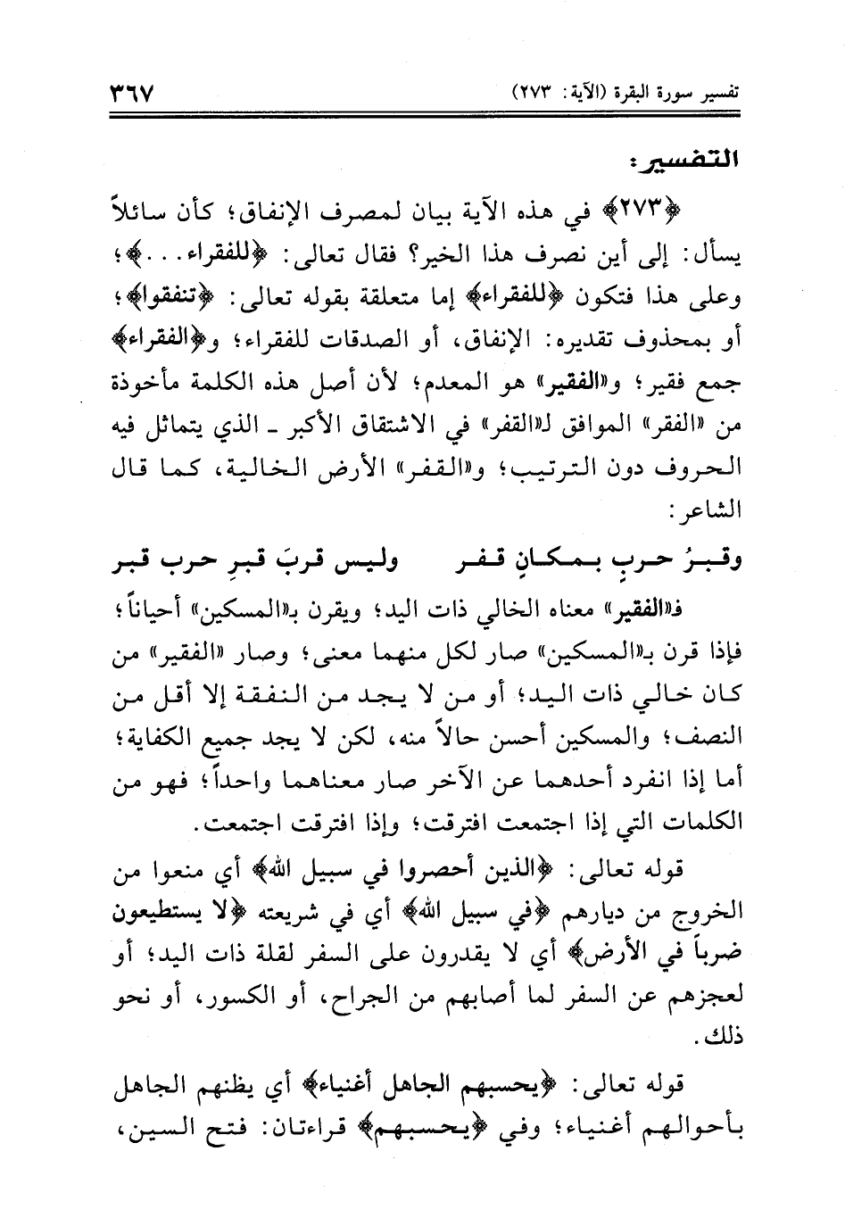 {٢٧٣} في هذه الآية بيان لمصرف الإنفاق؛ كأن سائلاً يسأل: إلى أين نصرف هذا الخير؟ فقال تعالى: {للفقراء ... }؛ وعلى هذا فتكون {للفقراء} إما متعلقة بقوله تعالى: {تنفقوا}؛ أو بمحذوف تقديره: الإنفاق، أو الصدقات للفقراء؛ و {الفقراء} جمع فقير؛ و «الفقير» هو المعدم؛ لأن أصل هذه الكلمة مأخوذة من «الفقر» الموافق لـ «القفر» في الاشتقاق الأكبر - الذي يتماثل فيه الحروف دون الترتيب؛ و «القفر» الأرض الخالية، كما قال الشاعر:
