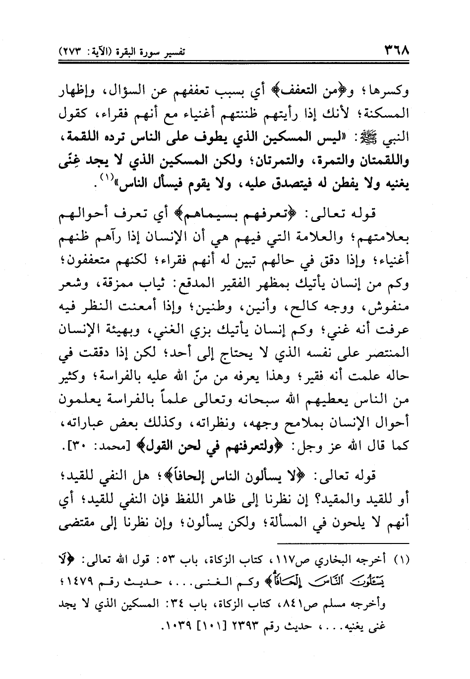 قوله تعالى: {تعرفهم بسيماهم} أي تعرف أحوالهم بعلامتهم؛ والعلامة التي فيهم هي أن الإنسان إذا رآهم ظنهم أغنياء؛ وإذا دقق في حالهم تبين له أنهم فقراء؛ لكنهم متعففون؛ وكم من إنسان يأتيك بمظهر الفقير المدقع: ثياب ممزقة، وشعر منفوش، ووجه كالح، وأنين، وطنين؛ وإذا أمعنت النظر فيه عرفت أنه غني؛ وكم إنسان يأتيك بزي الغني، وبهيئة الإنسان المنتصر على نفسه الذي لا يحتاج إلى أحد؛ لكن إذا دققت في حاله علمت أنه فقير؛ وهذا يعرفه من منّ الله عليه بالفراسة؛ وكثير من الناس يعطيهم الله سبحانه وتعالى علماً بالفراسة يعلمون أحوال الإنسان بملامح وجهه، ونظراته، وكذلك بعض عباراته، كما قال الله عز وجل: {ولتعرفنهم في لحن القول} [محمد: ٣٠].