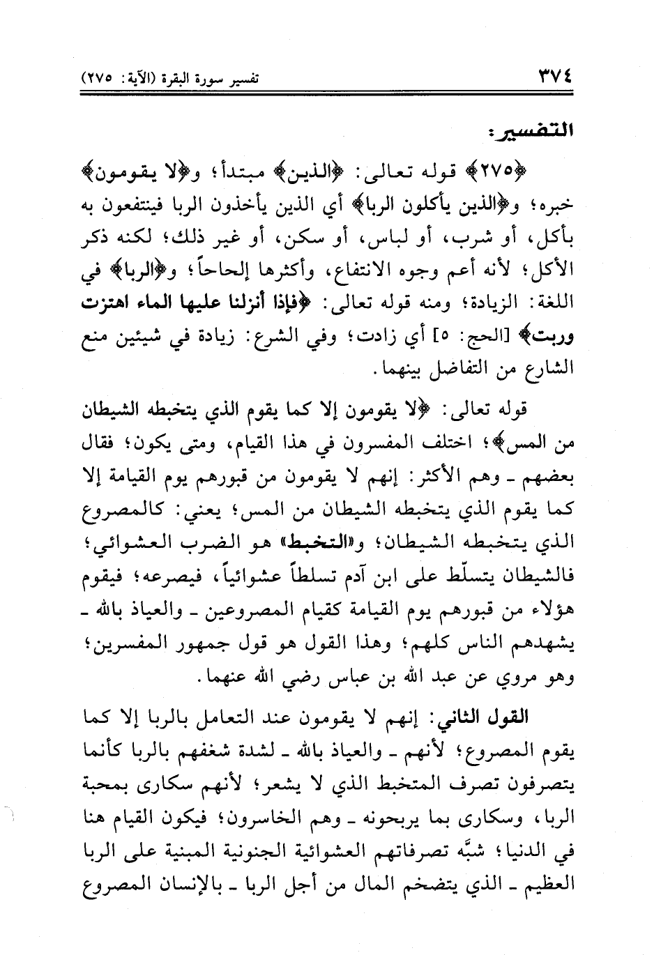 {٢٧٥} قوله تعالى: {الذين} مبتدأ؛ و {لا يقومون} خبره؛ و {الذين يأكلون الربا} أي الذين يأخذون الربا فينتفعون به بأكل، أو شرب، أو لباس، أو سكن، أو غير ذلك؛ لكنه ذكر الأكل؛ لأنه أعم وجوه الانتفاع، وأكثرها إلحاحاً؛ و {الربا} في اللغة: الزيادة؛ ومنه قوله تعالى: {فإذا أنزلنا عليها الماء اهتزت وربت} [الحج: ٥] أي زادت؛ وفي الشرع: زيادة في شيئين منع الشارع من التفاضل بينهما.