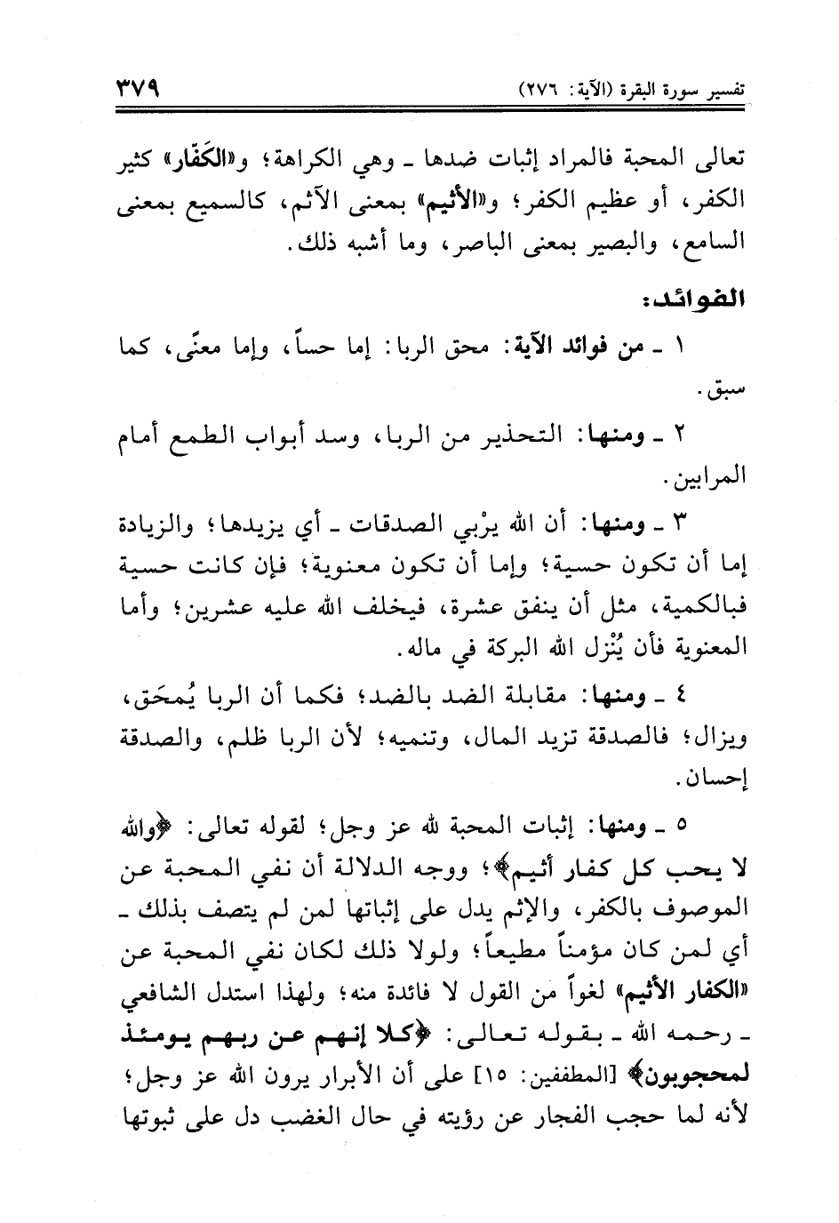 ٥ - ومنها: إثبات المحبة لله عز وجل؛ لقوله تعالى: {والله لا يحب كل كفار أثيم}؛ ووجه الدلالة أن نفي المحبة عن الموصوف بالكفر، والإثم يدل على إثباتها لمن لم يتصف بذلك - أي لمن كان مؤمناً مطيعاً؛ ولولا ذلك لكان نفي المحبة عن «الكفار الأثيم» لغواً من القول لا فائدة منه؛ ولهذا استدل الشافعي - رحمه الله - بقوله تعالى: {كلا إنهم عن ربهم يومئذ لمحجوبون} [المطففين: ١٥] على أن الأبرار يرون الله عز وجل؛ لأنه لما حجب الفجار عن رؤيته في حال الغضب دل على ثبوتها