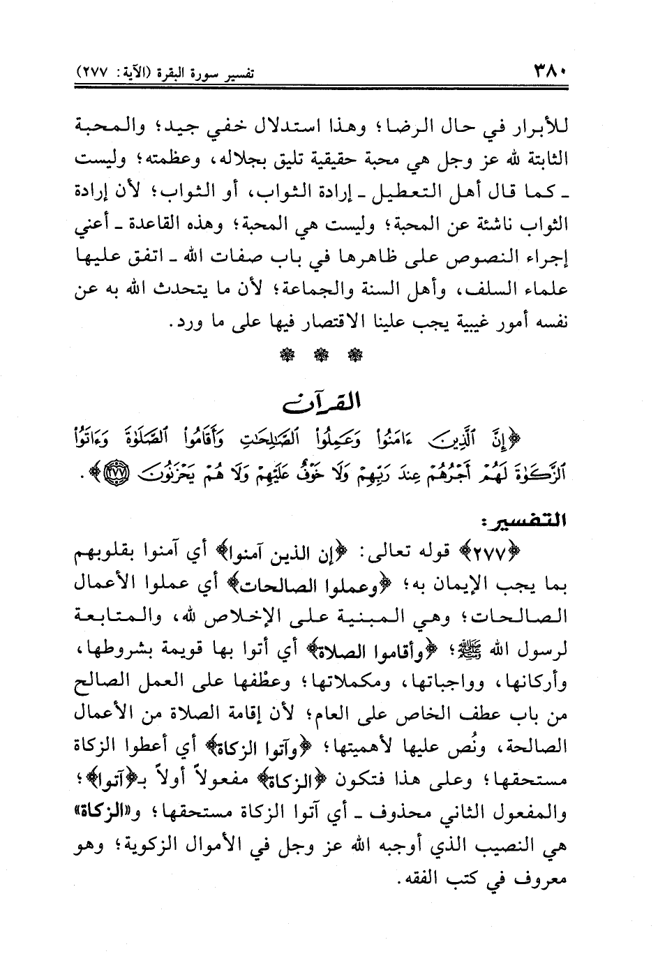 {٢٧٧} قوله تعالى: {إن الذين آمنوا} أي آمنوا بقلوبهم بما يجب الإيمان به؛ {وعملوا الصالحات} أي عملوا الأعمال الصالحات؛ وهي المبنية على الإخلاص لله، والمتابعة لرسول الله صلى الله عليه وسلم؛ {وأقاموا الصلاة} أي أتوا بها قويمة بشروطها، وأركانها، وواجباتها، ومكملاتها؛ وعطْفها على العمل الصالح من باب عطف الخاص على العام؛ لأن إقامة الصلاة من الأعمال الصالحة، ونُص عليها لأهميتها؛ {وآتوا الزكاة} أي أعطوا الزكاة مستحقها؛ وعلى هذا فتكون {الزكاة} مفعولاً أولاً بـ {آتوا}؛ والمفعول الثاني محذوف - أي آتوا الزكاة مستحقها؛ و «الزكاة» هي النصيب الذي أوجبه الله عز وجل في الأموال الزكوية؛ وهو معروف في كتب الفقه.