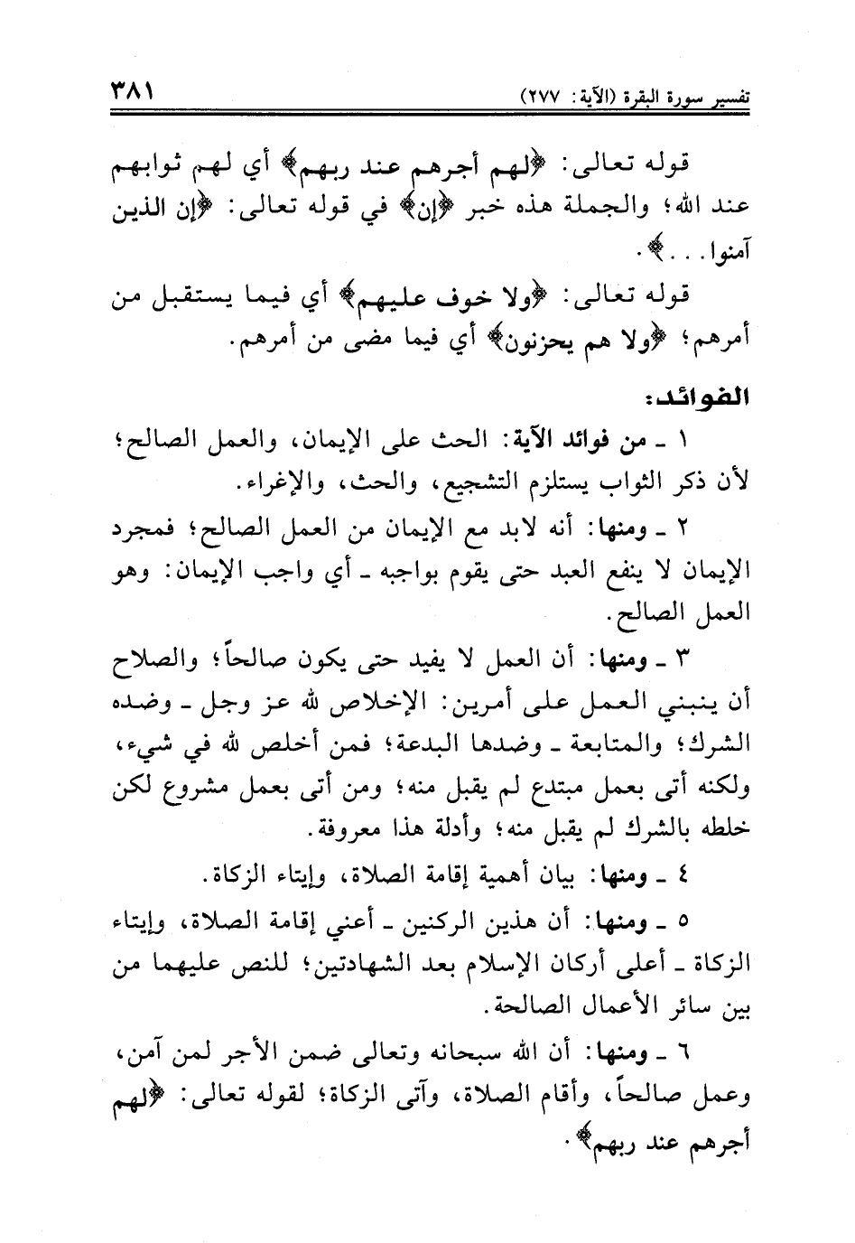 ٦ - ومنها: أن الله سبحانه وتعالى ضمن الأجر لمن آمن، وعمل صالحاً، وأقام الصلاة، وآتى الزكاة؛ لقوله تعالى: {لهم أجرهم عند ربهم}.