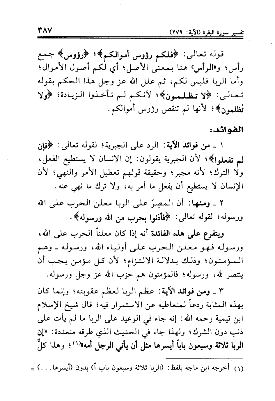 ٣ - ومن فوائد الآية: عظم الربا لعظم عقوبته؛ وإنما كان بهذه المثابة ردعاً لمتعاطيه عن الاستمرار فيه؛ قال شيخ الإسلام ابن تيمية رحمه الله: إنه جاء في الوعيد على الربا ما لم يأت على ذنب دون الشرك؛ ولهذا جاء في الحديث الذي طرقه متعددة: «إن الربا ثلاثة وسبعون باباً أيسرها مثل أن يأتي الرجل أمه» (¬١)؛ وهذا كلٌّ