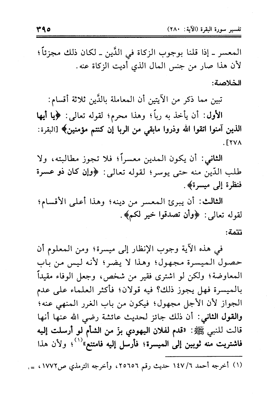 في هذه الآية وجوب الإنظار إلى ميسرة؛ ومن المعلوم أن حصول الميسرة مجهول؛ وهذا لا يضر؛ لأنه ليس من باب المعاوضة؛ ولكن لو اشترى فقير من شخص، وجعل الوفاء مقيداً بالميسرة فهل يجوز ذلك؟ فيه قولان؛ فأكثر العلماء على عدم الجواز لأن الأجل مجهول؛ فيكون من باب الغرر المنهي عنه؛ والقول الثاني: أن ذلك جائز لحديث عائشة رضي الله عنها أنها قالت للنبي صلى الله عليه وسلم: «قدم لفلان اليهودي بزّ من الشأم لو أرسلت إليه فاشتريت منه ثوبين إلى الميسرة؛ فأرسل إليه فامتنع» (¬١)؛ ولأن هذا