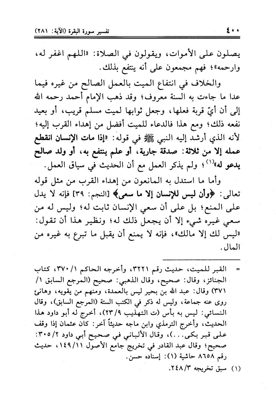 وأما ما استدل به المانعون من إهداء القرب من مثل قوله تعالى: {وأن ليس للإنسان إلا ما سعى} [النجم: ٣] فإنه لا يدل على المنع؛ بل على أن سعي الإنسان ثابت له؛ وليس له من سعي غيره شيء إلا أن يجعل ذلك له؛ ونظير هذا أن تقول: «ليس لك إلا مالك»، فإنه لا يمنع أن يقبل ما تبرع به غيره من المال.