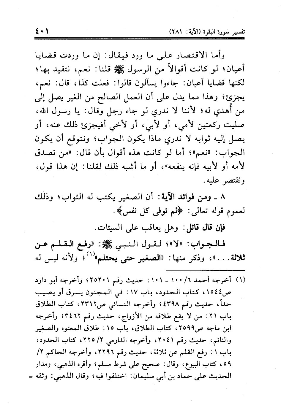 (¬١) أخرجه أحمد ٦/ ١٠٠ - ١٠١: حديث رقم ٢٥٢٠١؛ وأخرجه أبو داود ص ١٥٤٤، كتاب الحدود، باب ١٧: في المجنون يسرق أو يصيب حداً، حديث رقم ٤٣٩٨؛ وأخرجه النسائي ص ٢٣١٢، كتاب الطلاق باب ٢١: من لا يقع طلاقه من الأزواج، حديث رقم ٣٤٦٢؛ وأخرجه ابن ماجة ص ٢٥٩٩، كتاب الطلاق، باب ١٥: طلاق المعتوه والصغير والنائم، حديث رقم ٢٠٤١، وأخرجه الدارمي ٢/ ٢٢٥، كتاب الحدود، باب ١: رفع القلم عن ثلاثة، حديث رقم ٢٢٩٦، وأخرجه الحاكم ٢/ ٥٩، كتاب البيوع، وقال: صحيح على شرط مسلم؛ وأقره الذهبي، ومدار الحديث على حماد بن أبي سليمان: اختلفوا فيه؛ وقال الذهبي: وثقه ابن معين وغيره (الميزان ١/ ٥٩٥)؛ فهو حسن الحديث (تحرير التقريب ١/ ٣١٩)، وقال الألباني في صحيح أبي داود ٣/ ٥٥: صحيح، وقال عبد القادر في تخريج جامع الأصول ٣/ ٦١١، حاشية (٣): إسناده حسن.