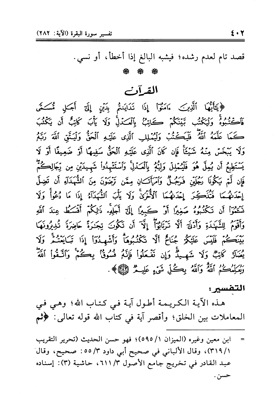 (يَا أَيُّهَا الَّذِينَ آمَنُوا إِذَا تَدَايَنْتُمْ بِدَيْنٍ إِلَى أَجَلٍ مُسَمّىً فَاكْتُبُوهُ وَلْيَكْتُبْ بَيْنَكُمْ كَاتِبٌ بِالْعَدْلِ وَلا يَأْبَ كَاتِبٌ أَنْ يَكْتُبَ كَمَا عَلَّمَهُ اللَّهُ فَلْيَكْتُبْ وَلْيُمْلِلِ الَّذِي عَلَيْهِ الْحَقُّ وَلْيَتَّقِ اللَّهَ رَبَّهُ وَلا يَبْخَسْ مِنْهُ شَيْئاً فَإِنْ كَانَ الَّذِي عَلَيْهِ الْحَقُّ سَفِيهاً أَوْ ضَعِيفاً أَوْ لا يَسْتَطِيعُ أَنْ يُمِلَّ هُوَ فَلْيُمْلِلْ وَلِيُّهُ بِالْعَدْلِ وَاسْتَشْهِدُوا شَهِيدَيْنِ مِنْ رِجَالِكُمْ فَإِنْ لَمْ يَكُونَا رَجُلَيْنِ فَرَجُلٌ وَامْرَأَتَانِ مِمَّنْ تَرْضَوْنَ مِنَ الشُّهَدَاءِ أَنْ تَضِلَّ إِحْدَاهُمَا فَتُذَكِّرَ إِحْدَاهُمَا الْأُخْرَى وَلا يَأْبَ الشُّهَدَاءُ إِذَا مَا دُعُوا وَلا تَسْأَمُوا أَنْ تَكْتُبُوهُ صَغِيراً أَوْ كَبِيراً إِلَى أَجَلِهِ ذَلِكُمْ أَقْسَطُ عِنْدَ اللَّهِ وَأَقْوَمُ لِلشَّهَادَةِ وَأَدْنَى أَلَّا تَرْتَابُوا إِلَاّ أَنْ تَكُونَ تِجَارَةً حَاضِرَةَ تُدِيرُونَهَا بَيْنَكُمْ فَلَيْسَ عَلَيْكُمْ جُنَاحٌ أَلَّا تَكْتُبُوهَا وَأَشْهِدُوا إِذَا تَبَايَعْتُمْ وَلا يُضَارَّ كَاتِبٌ وَلا شَهِيدٌ وَإِنْ تَفْعَلُوا فَإِنَّهُ فُسُوقٌ بِكُمْ وَاتَّقُوا اللَّهَ وَيُعَلِّمُكُمُ اللَّهُ وَاللَّهُ بِكُلِّ شَيْءٍ عَلِيمٌ) (البقرة: ٢٨٢)