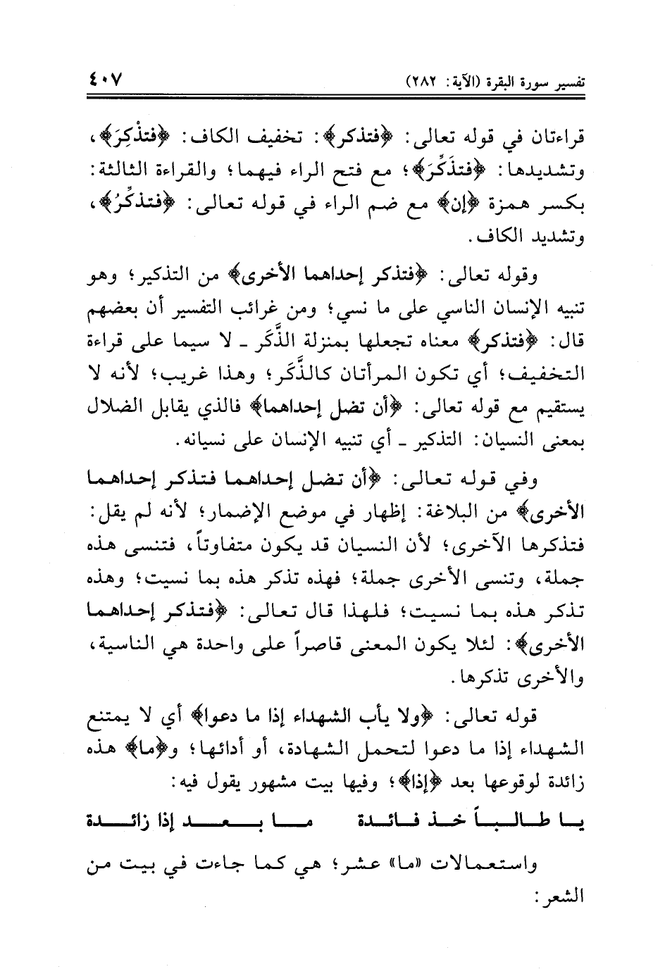 وفي قوله تعالى: {أن تضل إحداهما فتذكر إحداهما الأخرى} من البلاغة: إظهار في موضع الإضمار؛ لأنه لم يقل: فتذكرها الآخرى؛ لأن النسيان قد يكون متفاوتاً، فتنسى هذه جملة، وتنسى الأخرى جملة؛ فهذه تذكر هذه بما نسيت؛ وهذه تذكر هذه بما نسيت؛ فلهذا قال تعالى: {فتذكر إحداهما الأخرى}: لئلا يكون المعنى قاصراً على واحدة هي الناسية، والأخرى تذكرها.