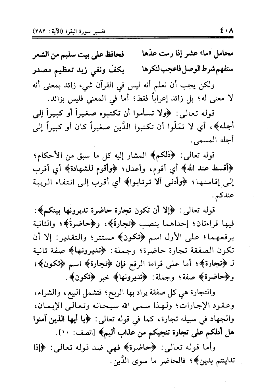قوله تعالى: {إلا أن تكون تجارة حاضرة تديرونها بينكم}: فيها قراءتان؛ إحداهما بنصب {تجارةً}، و {حاضرةً}؛ والثانية برفعهما؛ على الأول اسم {تكون} مستتر؛ والتقدير: إلا أن تكون الصفقة تجارة حاضرة؛ وجملة: {تديرونها} صفة ثانية لـ {تجارة}؛ أما على قراءة الرفع فإن {تجارة} اسم {تكون}؛ و {حاضرة} صفة؛ وجملة: {تديرونها} خبر {تكون}.