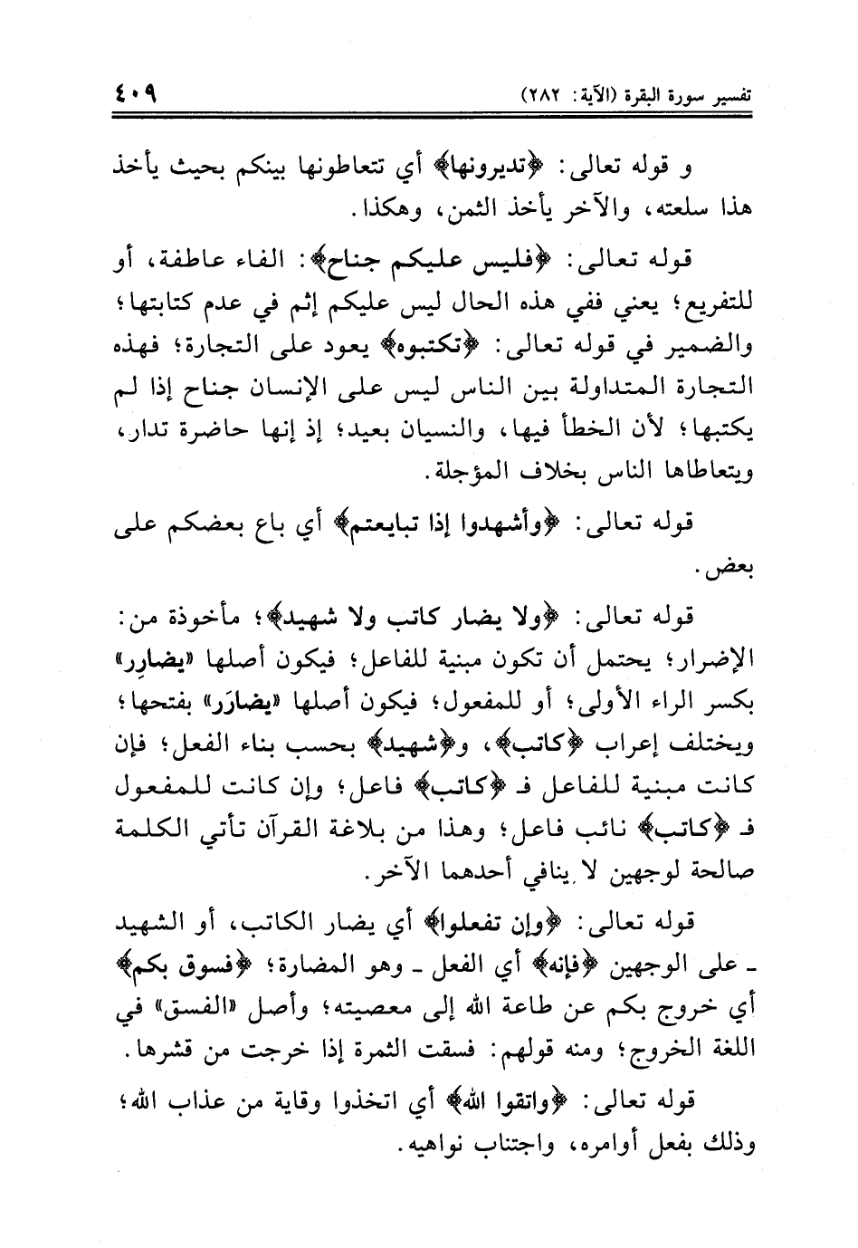 قوله تعالى: {ولا يضار كاتب ولا شهيد}؛ مأخوذة من: الإضرار؛ يحتمل أن تكون مبنية للفاعل؛ فيكون أصلها «يضارِر» بكسر الراء الأولى؛ أو للمفعول؛ فيكون أصلها «يضارَر» بفتحها؛ ويختلف إعراب {كاتب}، و {شهيد} بحسب بناء الفعل؛ فإن كانت مبنية للفاعل فـ {كاتب} فاعل؛ وإن كانت للمفعول فـ {كاتب} نائب فاعل؛ وهذا من بلاغة القرآن تأتي الكلمة صالحة لوجهين لا ينافي أحدهما الآخر.