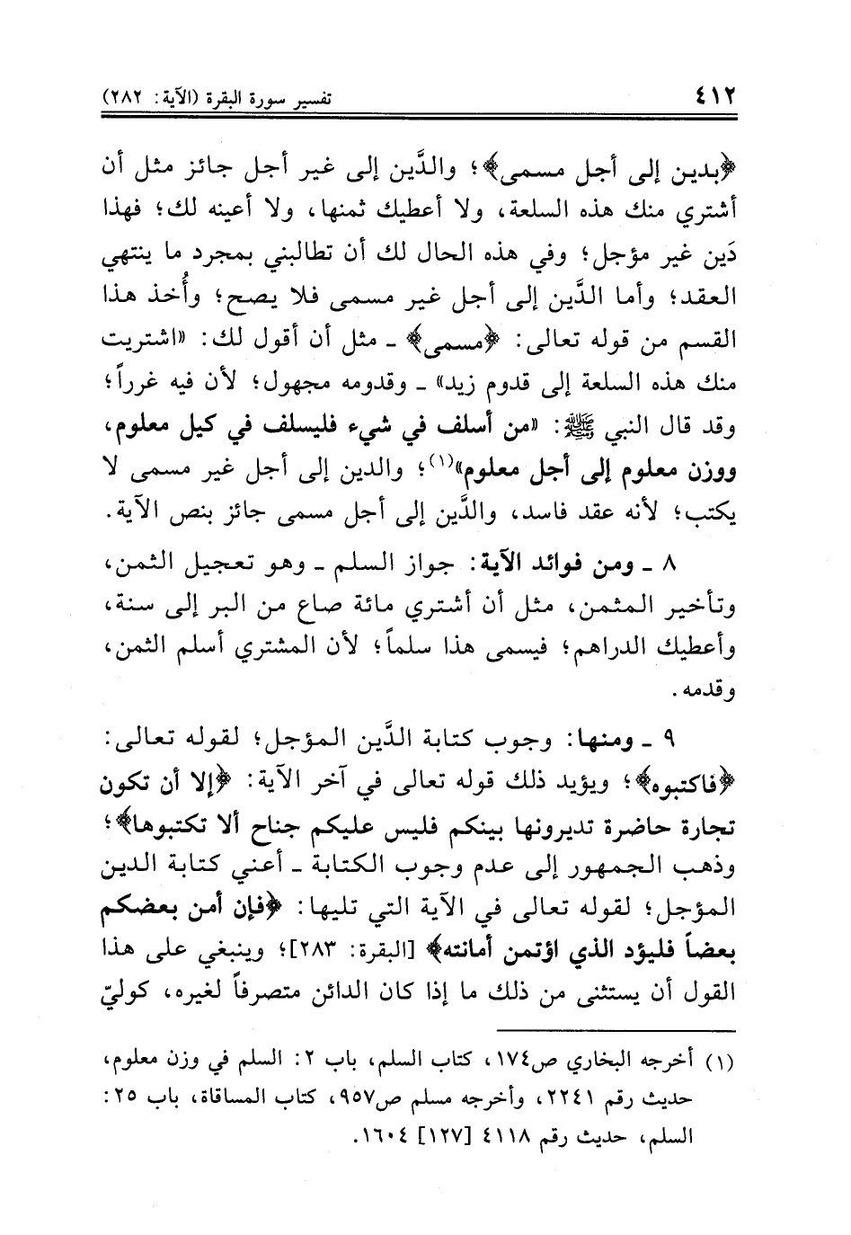٨ - ومن فوائد الآية: جواز السلم - وهو تعجيل الثمن، وتأخير المثمن، مثل أن أشتري مائة صاع من البر إلى سنة، وأعطيك الدراهم؛ فيسمى هذا سلماً؛ لأن المشتري أسلم الثمن، وقدمه.