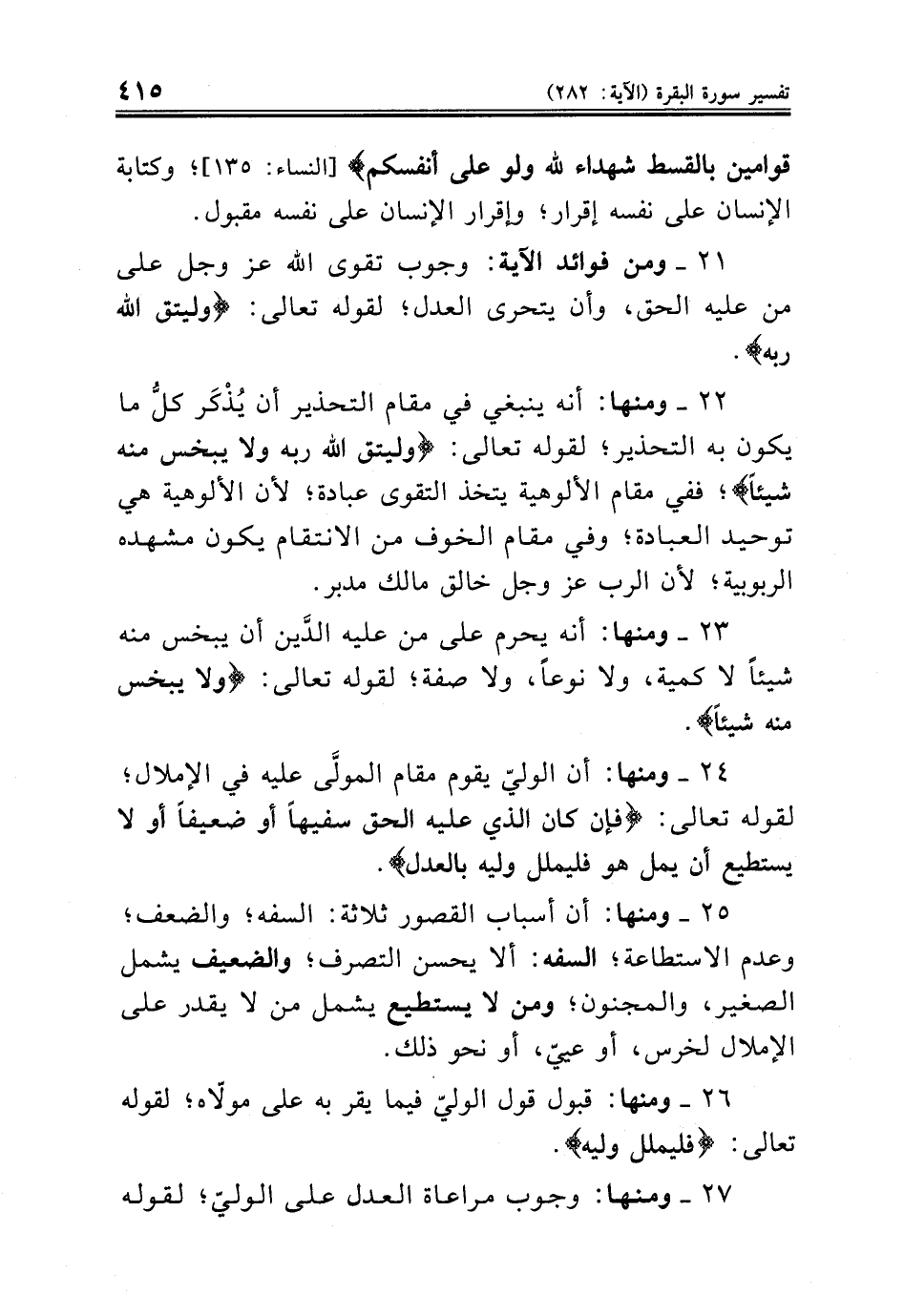 ٢١ - ومن فوائد الآية: وجوب تقوى الله عز وجل على من عليه الحق، وأن يتحرى العدل؛ لقوله تعالى: {وليتق الله ربه}.
