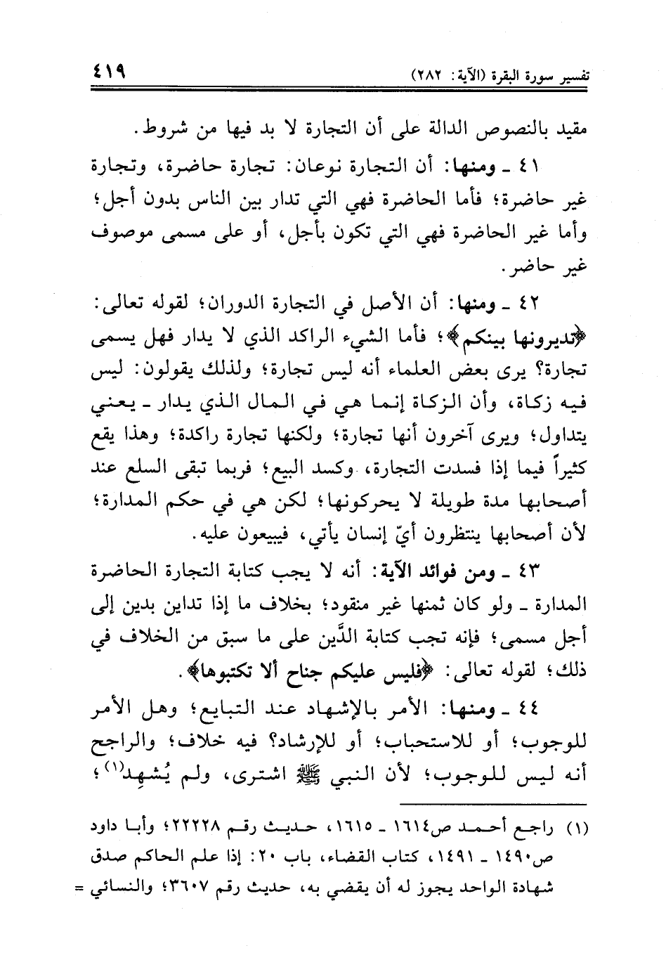 ٤٢ - ومنها: أن الأصل في التجارة الدوران؛ لقوله تعالى: {تديرونها بينكم}؛ فأما الشيء الراكد الذي لا يدار فهل يسمى تجارة؟ يرى بعض العلماء أنه ليس تجارة؛ ولذلك يقولون: ليس فيه زكاة، وأن الزكاة إنما هي في المال الذي يدار - يعني يتداول؛ ويرى آخرون أنها تجارة؛ ولكنها تجارة راكدة؛ وهذا يقع كثيراً فيما إذا فسدت التجارة، وكسد البيع؛ فربما تبقى السلع عند أصحابها مدة طويلة لا يحركونها؛ لكن هي في حكم المدارة؛ لأن أصحابها ينتظرون أيّ إنسان يأتي، فيبيعون عليه.