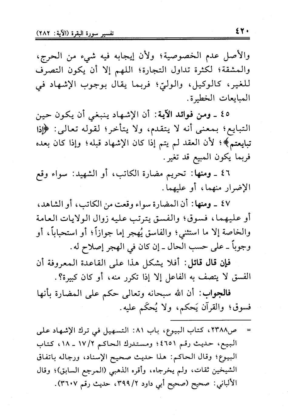 ٤٥ - ومن فوائد الآية: أن الإشهاد ينبغي أن يكون حين التبايع؛ بمعنى أنه لا يتقدم، ولا يتأخر؛ لقوله تعالى: {إذا تبايعتم}؛ لأن العقد لم يتم إذا كان الإشهاد قبله؛ وإذا كان بعده فربما يكون المبيع قد تغير.