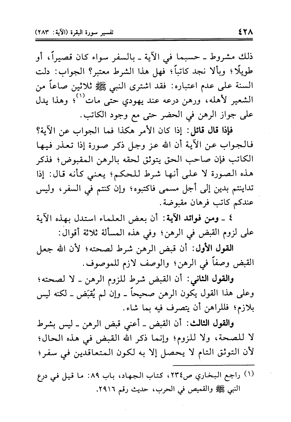 فإذا قال قائل: إذا كان الأمر هكذا فما الجواب عن الآية؟ فالجواب عن الآية أن الله عز وجل ذكر صورة إذا تعذر فيها الكاتب فإن صاحب الحق يتوثق لحقه بالرهن المقبوض؛ فذكر هذه الصورة لا على أنها شرط للحكم؛ يعني كأنه قال: إذا تداينتم بدين إلى أجل مسمى فاكتبوه؛ وإن كنتم في السفر، وليس عندكم كاتب فرهان مقبوضة.