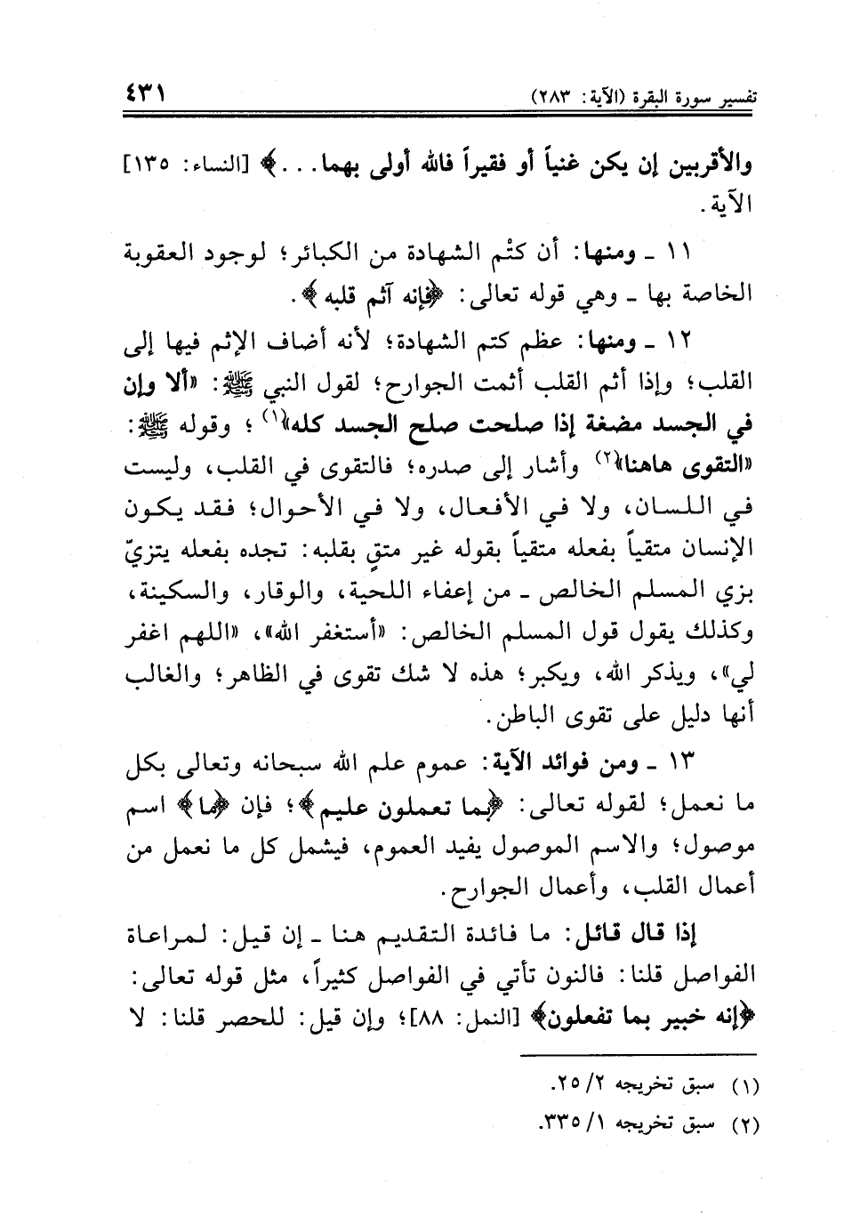 ١٢ - ومنها: عظم كتم الشهادة؛ لأنه أضاف الإثم فيها إلى القلب؛ وإذا أثم القلب أثمت الجوارح؛ لقول النبي صلى الله عليه وسلم: «ألا وإن في الجسد مضغة إذا صلحت صلح الجسد كله» (¬١)؛ وقوله صلى الله عليه وسلم: «التقوى هاهنا» (¬٢) وأشار إلى صدره؛ فالتقوى في القلب، وليست في اللسان، ولا في الأفعال، ولا في الأحوال؛ فقد يكون الإنسان متقياً بفعله متقياً بقوله غير متقٍ بقلبه: تجده بفعله يتزيّ بزي المسلم الخالص - من إعفاء اللحية، والوقار، والسكينة، وكذلك يقول قول المسلم الخالص: «أستغفر الله»، «اللهم اغفر لي»، ويذكر الله، ويكبر؛ هذه لا شك تقوى في الظاهر؛ والغالب أنها دليل على تقوى الباطن.