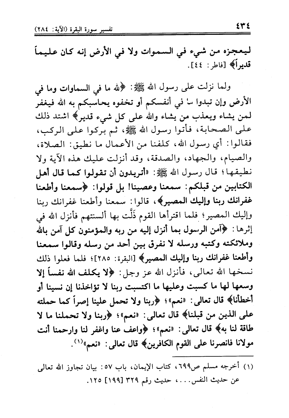ولما نزلت على رسول الله صلى الله عليه وسلم: {لله ما في السماوات وما في الأرض وإن تبدوا ما في أنفسكم أو تخفوه يحاسبكم به الله فيغفر لمن يشاء ويعذب من يشاء والله على كل شيء قدير} اشتد ذلك على الصحابة، فأتوا رسول الله صلى الله عليه وسلم، ثم بركوا على الركب، فقالوا: أي رسول الله، كلفنا من الأعمال ما نطيق: الصلاة، والصيام، والجهاد، والصدقة، وقد أنزلت عليك هذه الآية ولا نطيقها؛ قال رسول الله صلى الله عليه وسلم: «أتريدون أن تقولوا كما قال أهل الكتابين من قبلكم: سمعنا وعصينا! بل قولوا: {سمعنا وأطعنا غفرانك ربنا وإليك المصير}، قالوا: سمعنا وأطعنا غفرانك ربنا وإليك المصير؛ فلما اقترأها القوم ذَلَّت بها ألسنتهم فأنزل الله في إثرها: {آمن الرسول بما أنزل إليه من ربه والمؤمنون كل آمن بالله وملائكته وكتبه ورسله لا نفرق بين أحد من رسله وقالوا سمعنا وأطعنا غفرانك ربنا وإليك المصير} [البقرة: ٢٨٥]؛ فلما فعلوا ذلك نسخها الله تعالى، فأنزل الله عز وجل: {لا يكلف الله نفساً إلا وسعها لها ما كسبت وعليها ما اكتسبت ربنا لا تؤاخذنا إن نسينا أو أخطأنا} قال تعالى: «نعم»؛ {ربنا ولا تحمل علينا إصراً كما حملته على الذين من قبلنا} قال تعالى: «نعم»؛ {ربنا ولا تحملنا ما لا طاقة لنا به} قال تعالى: «نعم»؛ {واعف عنا واغفر لنا وارحمنا أنت مولانا فانصرنا على القوم الكافرين} قال تعالى: «نعم» (¬١).