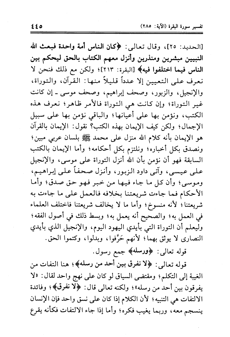 [الحديد: ٢٥]، وقال تعالى: {كان الناس أمة واحدة فبعث الله النبيين مبشرين ومنذرين وأنزل معهم الكتاب بالحق ليحكم بين الناس فيما اختلفوا فيه} [البقرة: ٢١٣]؛ ولكن مع ذلك فنحن لا نعرف على التعيين إلا عدداً قليلاً منها: القرآن، والتوراة، والإنجيل، والزبور، وصحف إبراهيم، وصحف موسى - إن كانت غير التوراة؛ وإن كانت هي التوراة فالأمر ظاهر؛ نعرف هذه الكتب، ونؤمن بها على أعيانها؛ والباقي نؤمن بها على سبيل الإجمال؛ ولكن كيف الإيمان بهذه الكتب؟ نقول: الإيمان بالقرآن هو الإيمان بأنه كلام الله منزل على محمد صلى الله عليه وسلم بلسان عربي مبين؛ ونصدق بكل أخباره؛ ونلتزم بكل أحكامه؛ وأما الإيمان بالكتب السابقة فهو أن نؤمن بأن الله أنزل التوراة على موسى، والإنجيل على عيسى، وآتى داود الزبور، وأنزل صحفاً على إبراهيم، وموسى؛ وأن كل ما جاء فيها من خبر فهو حق صدق؛ وأما الأحكام فما جاءت شريعتنا بخلافه فالعمل على ما جاءت به شريعتنا؛ لأنه منسوخ؛ وأما ما لا يخالف شريعتنا فاختلف العلماء في العمل به؛ والصحيح أنه يعمل به؛ وبسط ذلك في أصول الفقه؛ وليعلم أن التوراة التي بأيدي اليهود اليوم، والإنجيل الذي بأيدي النصارى لا يوثق بهما؛ لأنهم حَرَّفوا،
