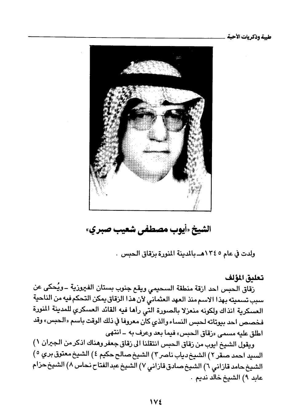 ويقول الشيخ ايوب من زقاق الحبس انتقلنا إلى زقاق جعفر وهناك اذكر من الجيرن 1) السيد أحمد صقر 2) الشيخ دياب ناصر 3) الشيخ صالح حكيم 4) الشيخ معتوق بري 5) الشيخ حامد قازاني 6) الشيخ صادق قازاني 7) الشيخ عبد الفتاح نحاس 8) الشيخ حزام عابد 9) الشيخ خالد نديم.