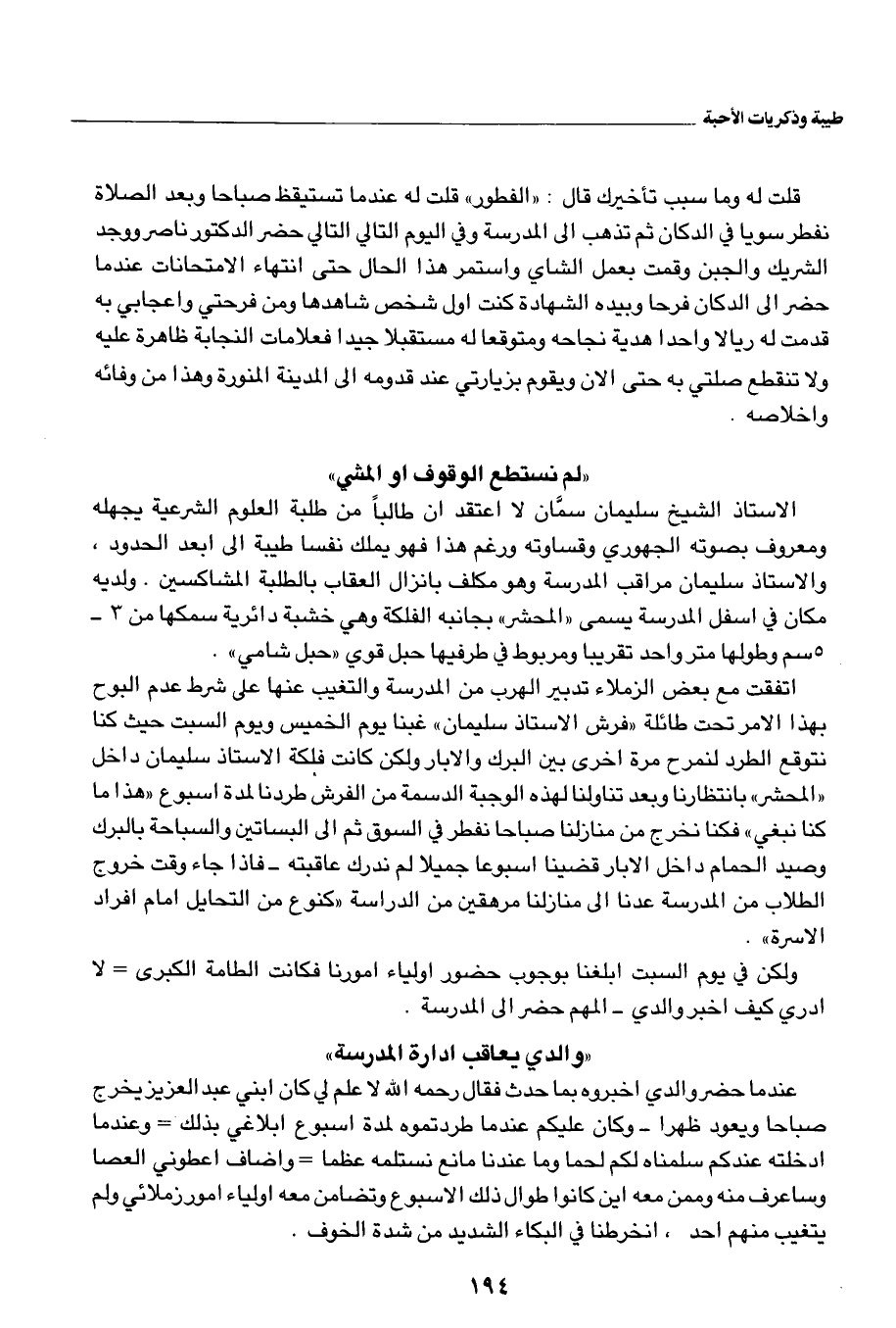 عندما حضر والدي اخبروه بما حدث فقال رحمه الله لا علم لي كان ابني عبد العزيز يخرج صباحا ويعود ظهرا - وكان عليكم عندما طردتموه لمدة اسبوع ابلاغي بذلك = وعندما ادخلته عندكم سلمناه لكم لحما وما عندنا مانع نستلمه عظما = واضاف اعطوني العصا وساعرف منه وممن معه اين كانوا طوال ذلك الاسبوع وتضامن معه اولياء امور زملائي ولم يتغيب منهم احد، انخرطنا في البكاء الشديد من شدة الخوف.