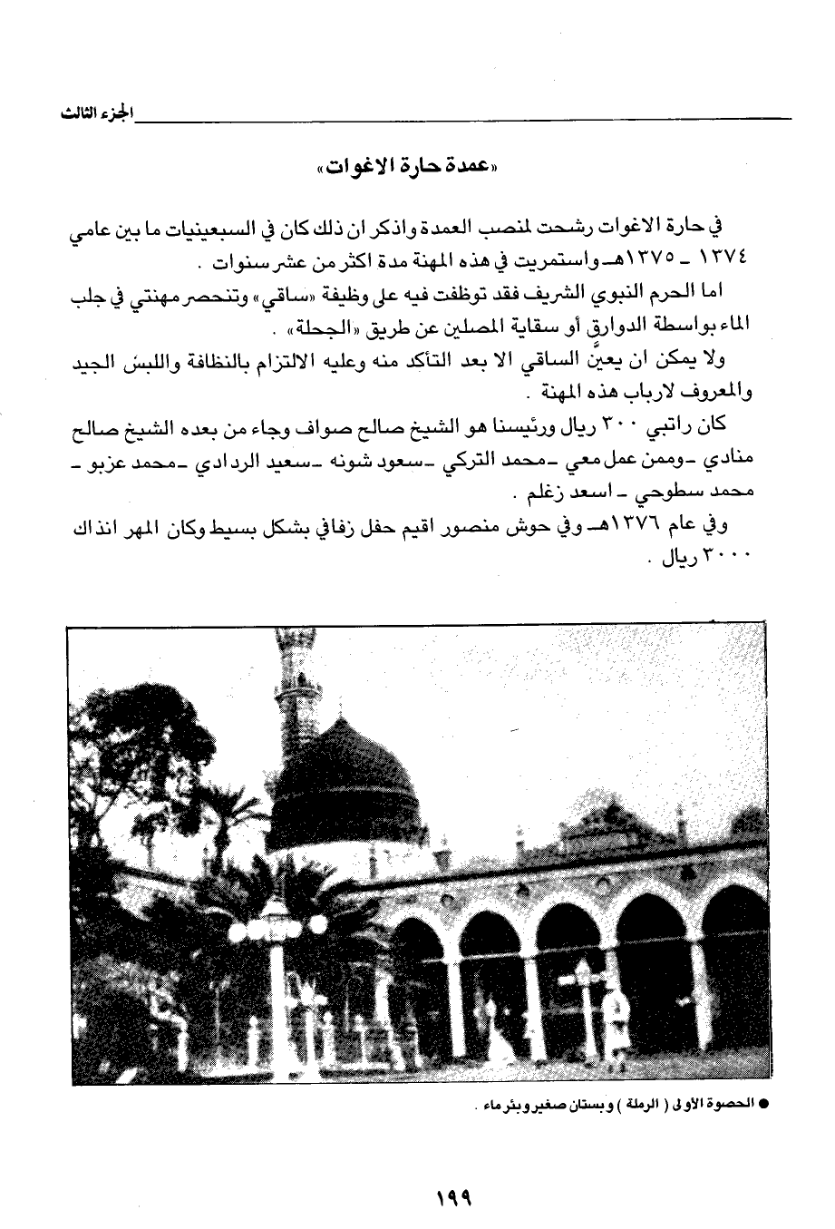 أما الحرم النبوي الشريف فقد توظفت فيه على وظيفة "ساقي" وتنحصر مهنتي في جلب الماء بواسطة الدوارق او سقاية المصلين عن طليق "الجحلة".