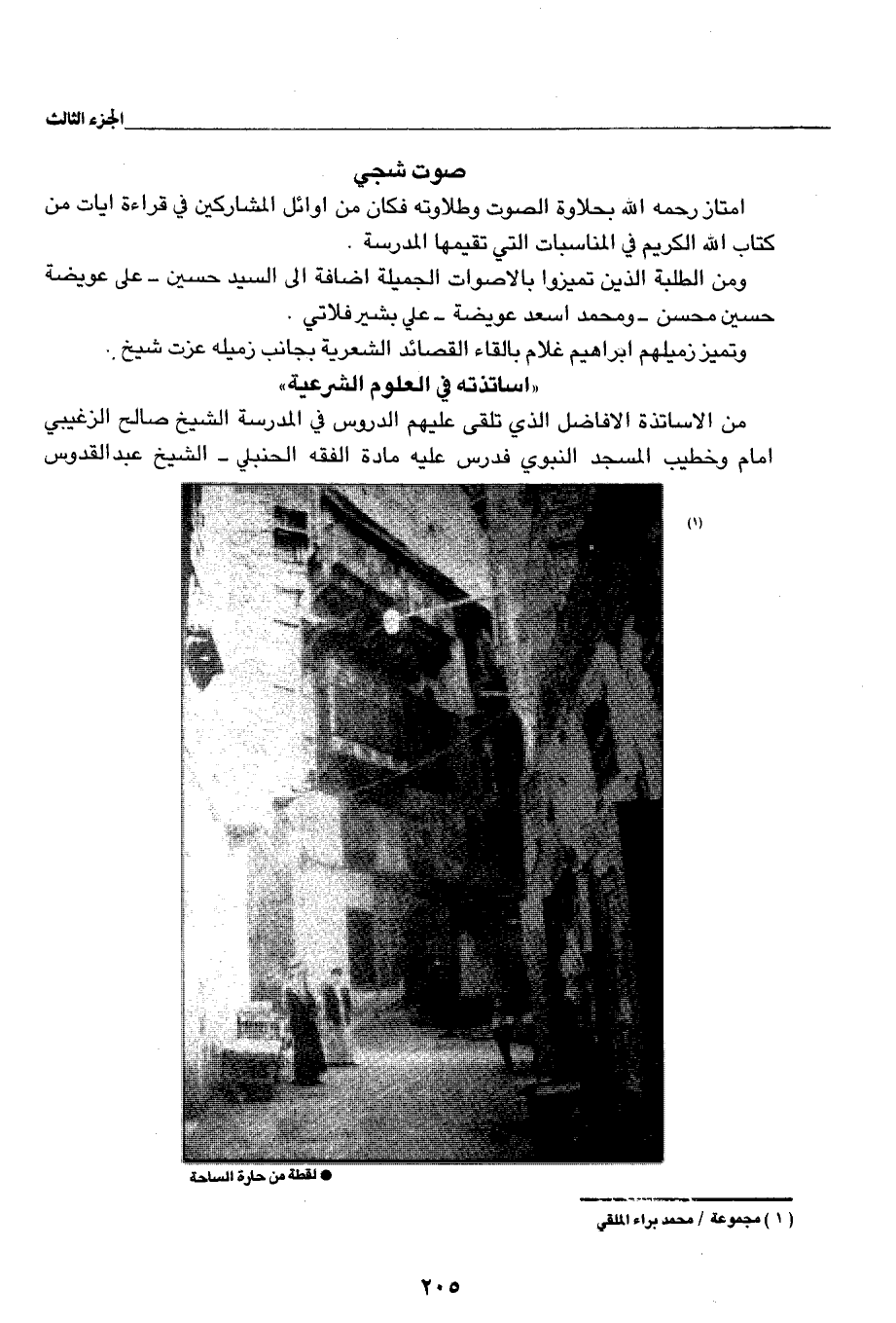 من الاساتذة الافاضل الذي تلقى عليهم الدروس في المدرسة الشيخ صالح الزغيبي امام وخطيب المسجد النبوي فدرس عليه ماده الفقه الحنبلي - الشيخ عبد القدوس (1) * لقطة من حارة الساحة…