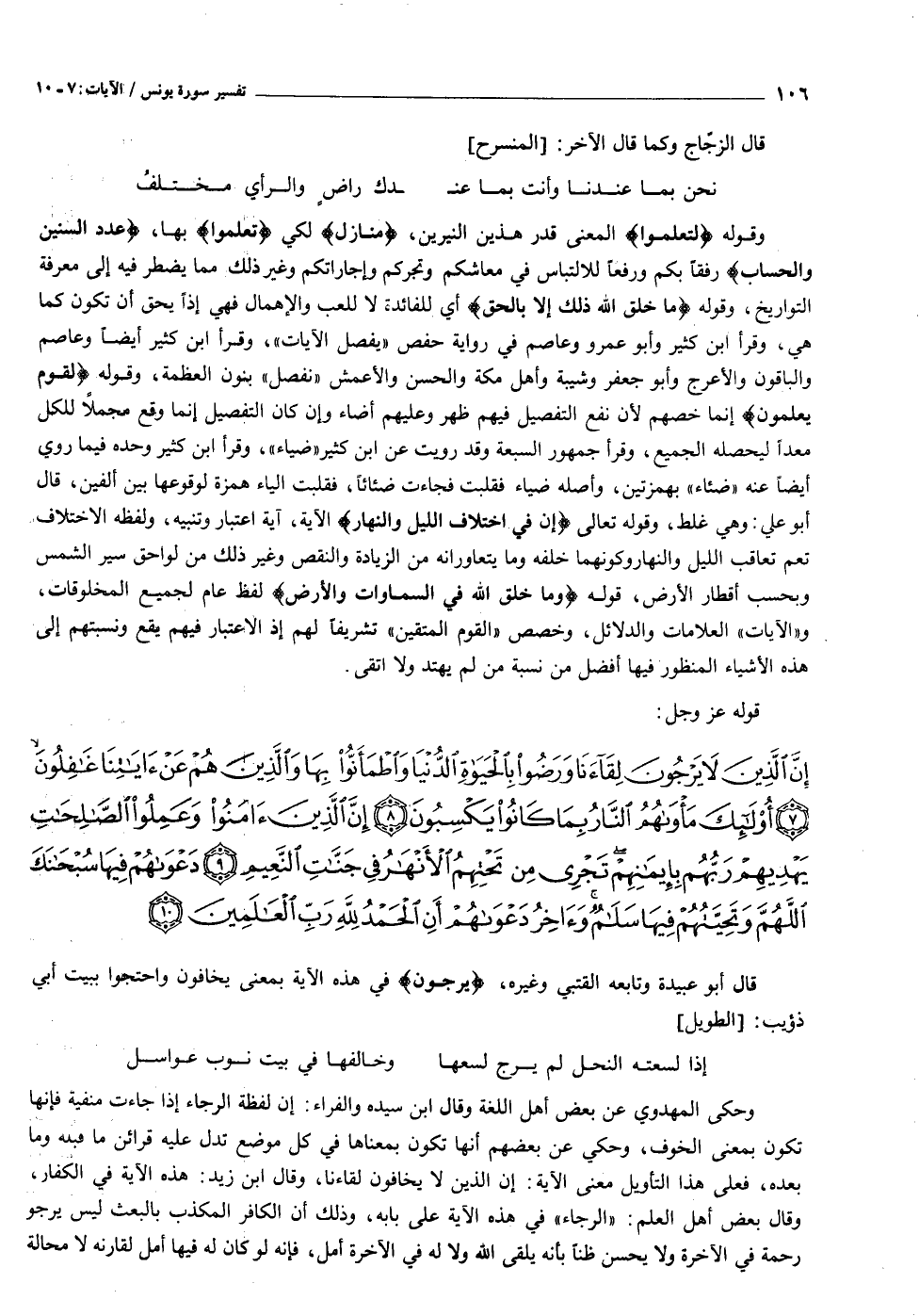 إِنَّ الَّذِينَ لا يَرْجُونَ لِقاءَنا وَرَضُوا بِالْحَياةِ الدُّنْيا وَاطْمَأَنُّوا بِها وَالَّذِينَ هُمْ عَنْ آياتِنا غافِلُونَ (٧) أُولئِكَ مَأْواهُمُ النَّارُ بِما كانُوا يَكْسِبُونَ (٨) إِنَّ الَّذِينَ آمَنُوا وَعَمِلُوا الصَّالِحاتِ يَهْدِيهِمْ رَبُّهُمْ بِإِيمانِهِمْ تَجْرِي مِنْ تَحْتِهِمُ الْأَنْهارُ فِي جَنَّاتِ النَّعِيمِ (٩) دَعْواهُمْ فِيها سُبْحانَكَ اللَّهُمَّ وَتَحِيَّتُهُمْ فِيها سَلامٌ وَآخِرُ دَعْواهُمْ أَنِ الْحَمْدُ لِلَّهِ رَبِّ الْعالَمِينَ (١٠)