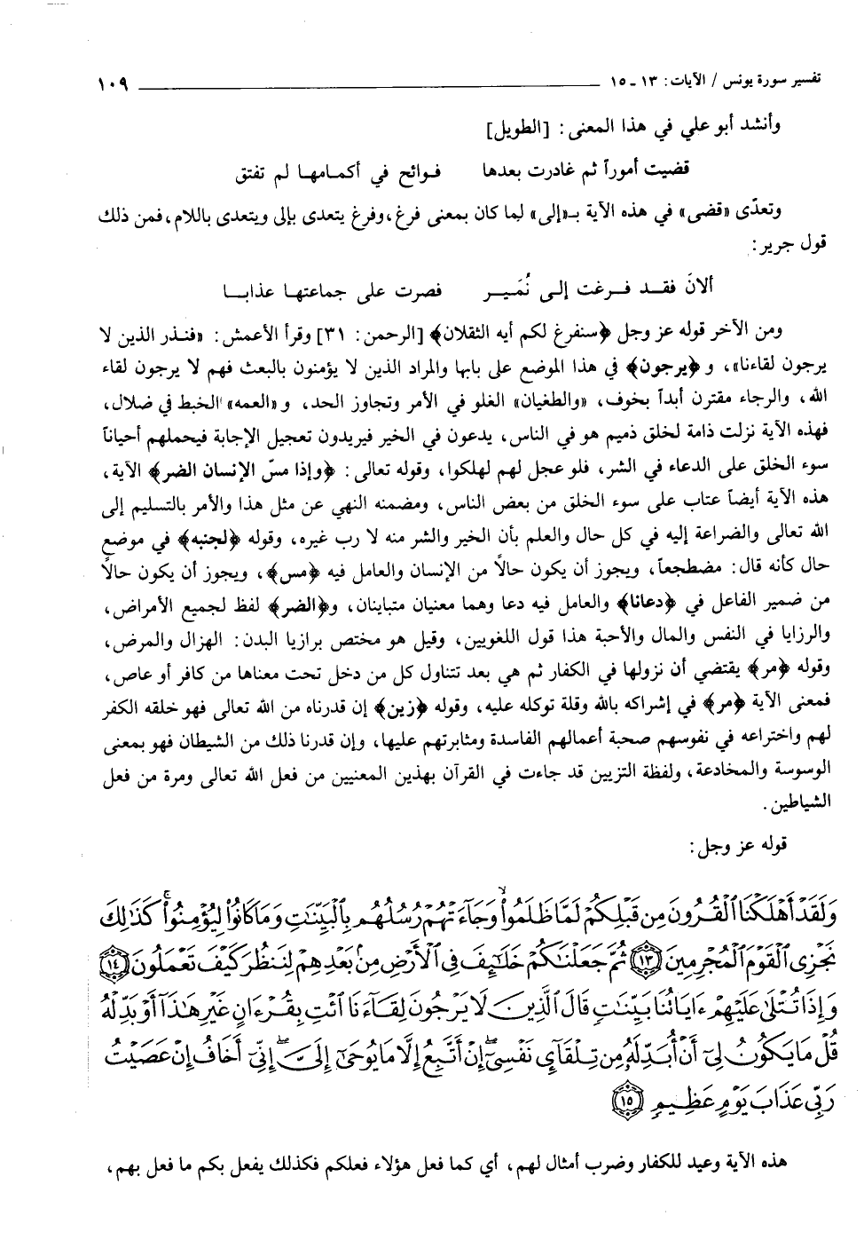 وَلَقَدْ أَهْلَكْنَا الْقُرُونَ مِنْ قَبْلِكُمْ لَمَّا ظَلَمُوا وَجاءَتْهُمْ رُسُلُهُمْ بِالْبَيِّناتِ وَما كانُوا لِيُؤْمِنُوا كَذلِكَ نَجْزِي الْقَوْمَ الْمُجْرِمِينَ (١٣) ثُمَّ جَعَلْناكُمْ خَلائِفَ فِي الْأَرْضِ مِنْ بَعْدِهِمْ لِنَنْظُرَ كَيْفَ تَعْمَلُونَ (١٤) وَإِذا تُتْلى عَلَيْهِمْ آياتُنا بَيِّناتٍ قالَ الَّذِينَ لا يَرْجُونَ لِقاءَنَا ائْتِ بِقُرْآنٍ غَيْرِ هذا أَوْ بَدِّلْهُ قُلْ ما يَكُونُ لِي أَنْ أُبَدِّلَهُ مِنْ تِلْقاءِ نَفْسِي إِنْ أَتَّبِعُ إِلاَّ ما يُوحى إِلَيَّ إِنِّي أَخافُ إِنْ عَصَيْتُ رَبِّي عَذابَ يَوْمٍ عَظِيمٍ (١٥)