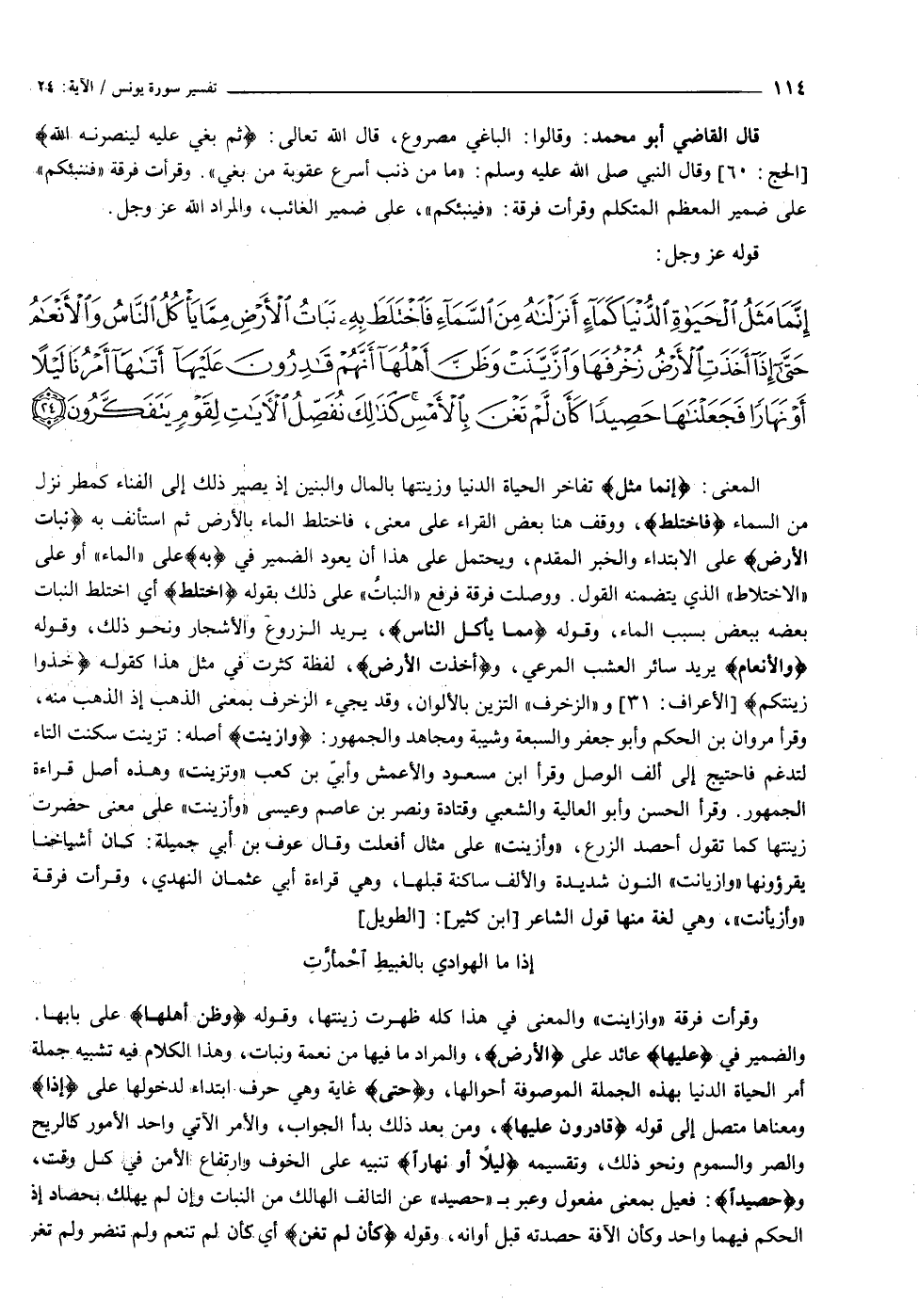 المعنى: إِنَّما مَثَلُ تفاخر الحياة الدنيا وزينتها بالمال والبنين إذ يصير ذلك إلى الفناء كمطر نزل من السماء فَاخْتَلَطَ، ووقف هنا بعض القراء على معنى، فاختلط الماء بالأرض ثم استأنف به نَباتُ الْأَرْضِ على الابتداء والخبر المقدم، ويحتمل على هذا أن يعود الضمير في بِهِ على «الماء» أو على «الاختلاط» الذي يتضمنه القول. ووصلت فرقة فرفع «النبات» على ذلك بقوله اختلط أي اختلط النبات بعضه ببعض بسبب الماء، وقوله مِمَّا يَأْكُلُ النَّاسُ، يريد الزروع والأشجار ونحو ذلك، وقوله وَالْأَنْعامُ يريد سائر العشب المرعي، وأَخَذَتِ الْأَرْضُ، لفظة كثرت في مثل هذا كقوله خُذُوا زِينَتَكُمْ [الأعراف: ٣١] و «الزخرف» التزين بالألوان، وقد يجيء الزخرف بمعنى الذهب إذ الذهب منه، وقرأ مروان بن الحكم وأبو جعفر والسبعة وشيبة ومجاهد والجمهور: وَازَّيَّنَتْ أصله: تزينت سكنت التاء لتدغم فاحتيج إلى ألف الوصل وقرأ ابن مسعود والأعمش وأبيّ بن كعب «وتزينت» وهذه أصل قراءة الجمهور. وقرأ الحسن وأبو العالية والشعبي وقتادة ونصر بن عاصم وعيسى «وأزينت» على معنى حضرت زينتها كما تقول أحصد الزرع، «وأزينت» على مثال أفعلت وقال عوف بن أبي جميلة: كان أشياخنا يقرؤونها «وازيانت» النون شديدة والألف ساكنة قبلها، وهي قراءة أبي عثمان النهدي، وقرأت فرقة «وازيأنت» ، وهي لغة منها قول الشاعر [ابن كثير] : [الطويل] إذا ما الهوادي بالغبيط احمأرّت وقرأت فرقة «وازاينت» والمعنى في هذا كله ظهرت زينتها، وقوله وَظَنَّ أَهْلُها على بابها.