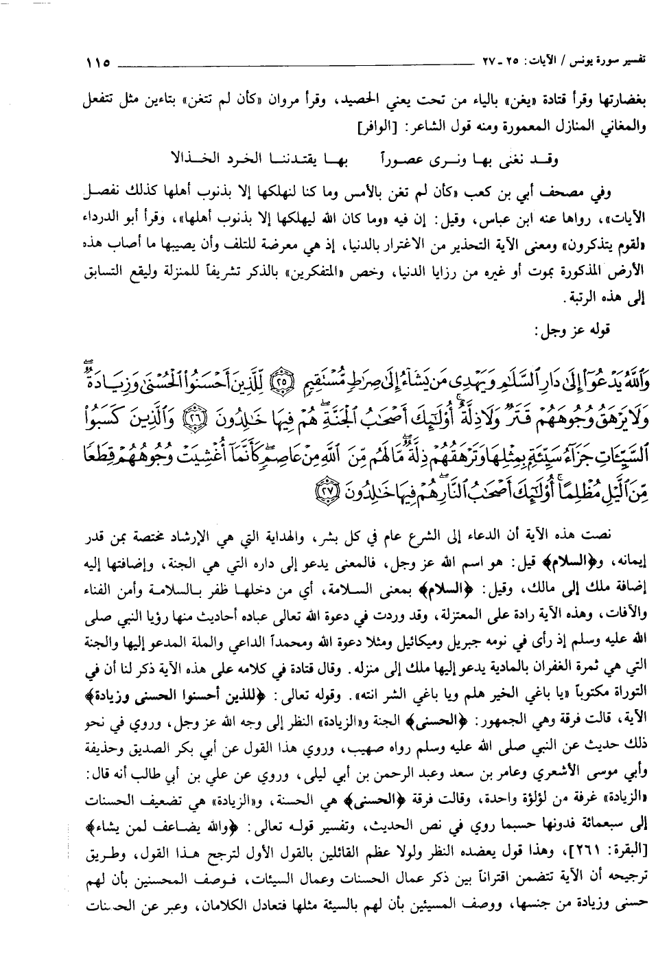 وَاللَّهُ يَدْعُوا إِلى دارِ السَّلامِ وَيَهْدِي مَنْ يَشاءُ إِلى صِراطٍ مُسْتَقِيمٍ (٢٥) لِلَّذِينَ أَحْسَنُوا الْحُسْنى وَزِيادَةٌ وَلا يَرْهَقُ وُجُوهَهُمْ قَتَرٌ وَلا ذِلَّةٌ أُولئِكَ أَصْحابُ الْجَنَّةِ هُمْ فِيها خالِدُونَ (٢٦) وَالَّذِينَ كَسَبُوا السَّيِّئاتِ جَزاءُ سَيِّئَةٍ بِمِثْلِها وَتَرْهَقُهُمْ ذِلَّةٌ ما لَهُمْ مِنَ اللَّهِ مِنْ عاصِمٍ كَأَنَّما أُغْشِيَتْ وُجُوهُهُمْ قِطَعاً مِنَ اللَّيْلِ مُظْلِماً أُولئِكَ أَصْحابُ النَّارِ هُمْ فِيها خالِدُونَ (٢٧)