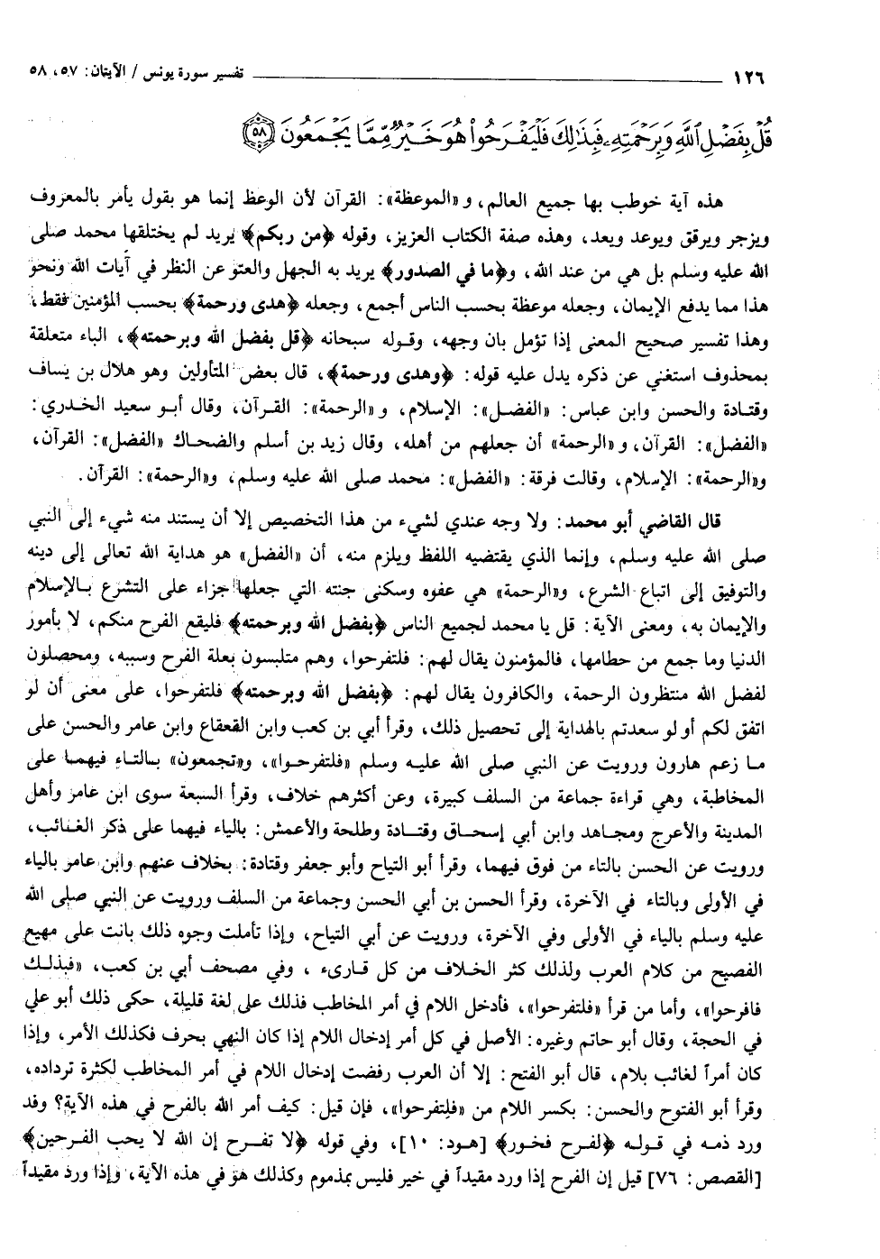 قال القاضي أبو محمد: ولا وجه عندي لشيء من هذا التخصيص إلا أن يستند منه شيء إلى النبي صلى الله عليه وسلم، وإنما الذي يقتضيه اللفظ ويلزم منه، أن «الفضل» هو هداية الله تعالى إلى دينه والتوفيق إلى اتباع الشرع، و «الرحمة» هي عفوه وسكنى جنته التي جعلها جزاء على التشرع بالإسلام والإيمان به، ومعنى الآية: قل يا محمد لجميع الناس بِفَضْلِ اللَّهِ وَبِرَحْمَتِهِ فليقع الفرح منكم، لا بأمور الدنيا وما جمع من حطامها، فالمؤمنون يقال لهم: فلتفرحوا، وهم متلبسون بعلة الفرح وسببه، ومحصلون لفضل الله منتظرون الرحمة، والكافرون يقال لهم: بِفَضْلِ اللَّهِ وَبِرَحْمَتِهِ فلتفرحوا، على معنى أن لو اتفق لكم أو لو سعدتم بالهداية إلى تحصيل ذلك، وقرأ أبي بن كعب وابن القعقاع وابن عامر والحسن على ما زعم هارون ورويت عن النبي صلى الله عليه وسلم «فلتفرحوا» ، و «تجمعون» بالتاء فيهما على المخاطبة، وهي قراءة جماعة من السلف كبيرة، وعن أكثرهم خلاف، وقرأ السبعة سوى ابن عامر وأهل المدينة والأعرج ومجاهد وابن أبي إسحاق وقتادة وطلحة والأعمش: بالياء فيهما على ذكر الغائب، ورويت عن الحسن بالتاء من فوق فيهما، وقرأ أبو التياح وأبو جعفر وقتادة: بخلاف عنهم وابن عامر بالياء في الأولى وبالتاء في الآخرة، وقرأ الحسن بن أبي الحسن وجماعة من السلف ورويت عن النبي صلى الله عليه وسلم بالياء في الأولى وفي الآخرة، ورويت عن أبي التياح، وإذا تأملت وجوه ذلك بانت على مهيع الفصيح من كلام العرب ولذلك كثر الخلاف من كل قارئ، وفي مصحف أبي بن كعب، «فبذلك فافرحوا» ، وأما من قرأ «فلتفرحوا» ، فأدخل اللام في أمر المخاطب فذلك على لغة قليلة، حكى ذلك أبو علي في الحجة، وقال أبو حاتم وغيره: الأصل في كل أمر إدخال اللام إذا كان النهي بحرف فكذلك الأمر، وإذا كان أمرا لغائب بلام، قال أبو الفتح: إلا أن العرب رفضت إدخال اللام في أمر المخاطب لكثرة ترداده، وقرأ أبو الفتوح والحسن: بكسر اللام من «فلتفرحوا» ، فإن قيل: كيف أمر الله بالفرح في هذه الآية؟ وقد ورد ذمه في قوله لَفَرِحٌ فَخُورٌ [هود: ١٠] ، وفي قوله لا تَفْرَحْ إِنَّ اللَّهَ لا يُحِبُّ الْفَرِحِينَ [القصص: ٧٦] قيل إن الفرح إذا ورد مقيدا في خير فليس بمذموم وكذلك هو في هذه الآية، وإذا ورد مقيدا
