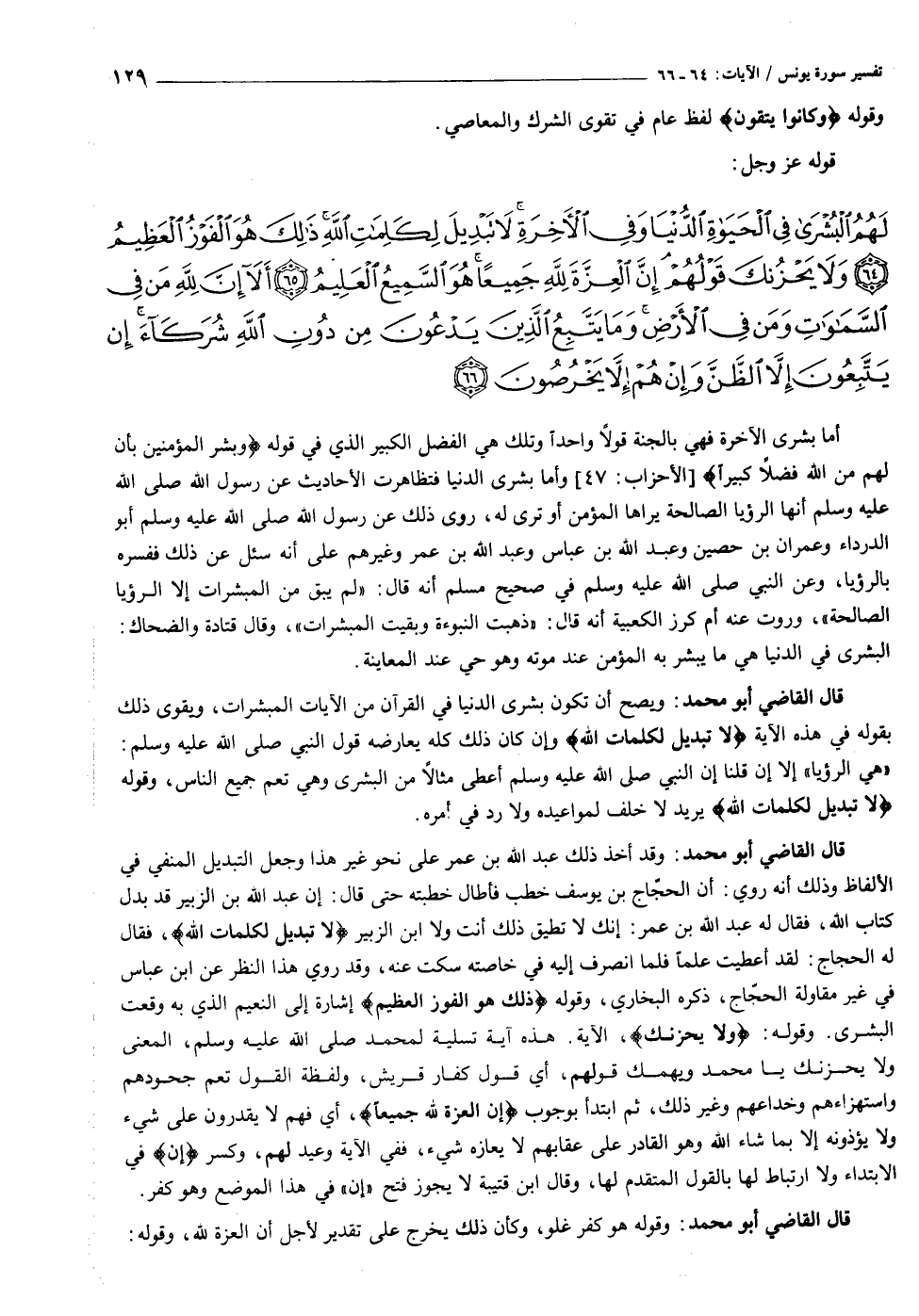 لَهُمُ الْبُشْرى فِي الْحَياةِ الدُّنْيا وَفِي الْآخِرَةِ لا تَبْدِيلَ لِكَلِماتِ اللَّهِ ذلِكَ هُوَ الْفَوْزُ الْعَظِيمُ (٦٤) وَلا يَحْزُنْكَ قَوْلُهُمْ إِنَّ الْعِزَّةَ لِلَّهِ جَمِيعاً هُوَ السَّمِيعُ الْعَلِيمُ (٦٥) أَلا إِنَّ لِلَّهِ مَنْ فِي السَّماواتِ وَمَنْ فِي الْأَرْضِ وَما يَتَّبِعُ الَّذِينَ يَدْعُونَ مِنْ دُونِ اللَّهِ شُرَكاءَ إِنْ يَتَّبِعُونَ إِلاَّ الظَّنَّ وَإِنْ هُمْ إِلاَّ يَخْرُصُونَ (٦٦)