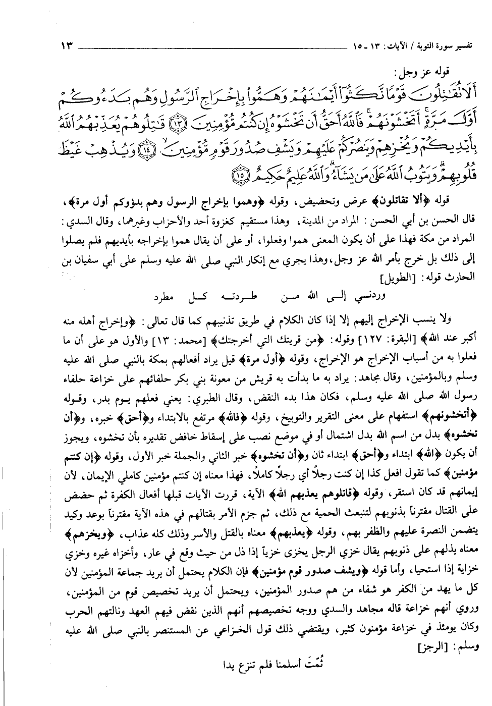 أَلا تُقاتِلُونَ قَوْماً نَكَثُوا أَيْمانَهُمْ وَهَمُّوا بِإِخْراجِ الرَّسُولِ وَهُمْ بَدَؤُكُمْ أَوَّلَ مَرَّةٍ أَتَخْشَوْنَهُمْ فَاللَّهُ أَحَقُّ أَنْ تَخْشَوْهُ إِنْ كُنْتُمْ مُؤْمِنِينَ (١٣) قاتِلُوهُمْ يُعَذِّبْهُمُ اللَّهُ بِأَيْدِيكُمْ وَيُخْزِهِمْ وَيَنْصُرْكُمْ عَلَيْهِمْ وَيَشْفِ صُدُورَ قَوْمٍ مُؤْمِنِينَ (١٤) وَيُذْهِبْ غَيْظَ قُلُوبِهِمْ وَيَتُوبُ اللَّهُ عَلى مَنْ يَشاءُ وَاللَّهُ عَلِيمٌ حَكِيمٌ (١٥)