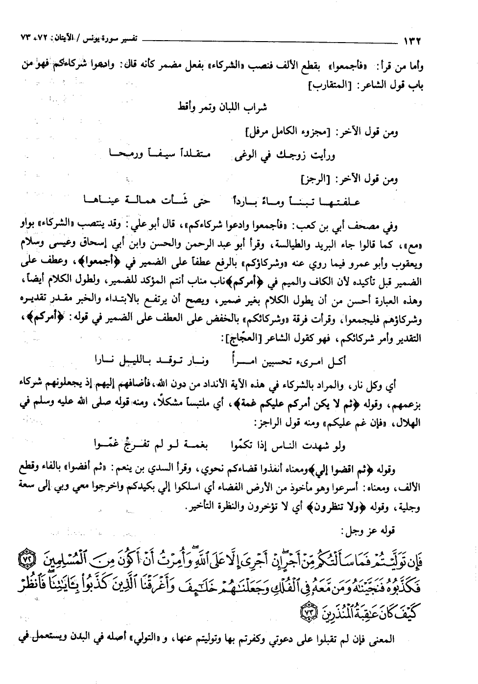 فَإِنْ تَوَلَّيْتُمْ فَما سَأَلْتُكُمْ مِنْ أَجْرٍ إِنْ أَجْرِيَ إِلاَّ عَلَى اللَّهِ وَأُمِرْتُ أَنْ أَكُونَ مِنَ الْمُسْلِمِينَ (٧٢) فَكَذَّبُوهُ فَنَجَّيْناهُ وَمَنْ مَعَهُ فِي الْفُلْكِ وَجَعَلْناهُمْ خَلائِفَ وَأَغْرَقْنَا الَّذِينَ كَذَّبُوا بِآياتِنا فَانْظُرْ كَيْفَ كانَ عاقِبَةُ الْمُنْذَرِينَ (٧٣)