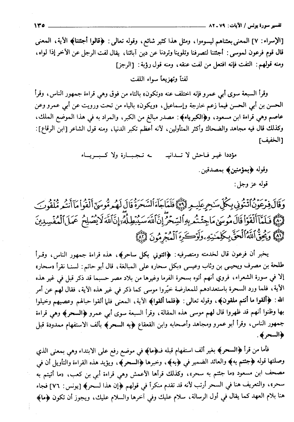 وَقالَ فِرْعَوْنُ ائْتُونِي بِكُلِّ ساحِرٍ عَلِيمٍ (٧٩) فَلَمَّا جاءَ السَّحَرَةُ قالَ لَهُمْ مُوسى أَلْقُوا ما أَنْتُمْ مُلْقُونَ (٨٠) فَلَمَّا أَلْقَوْا قالَ مُوسى ما جِئْتُمْ بِهِ السِّحْرُ إِنَّ اللَّهَ سَيُبْطِلُهُ إِنَّ اللَّهَ لا يُصْلِحُ عَمَلَ الْمُفْسِدِينَ (٨١) وَيُحِقُّ اللَّهُ الْحَقَّ بِكَلِماتِهِ وَلَوْ كَرِهَ الْمُجْرِمُونَ (٨٢)