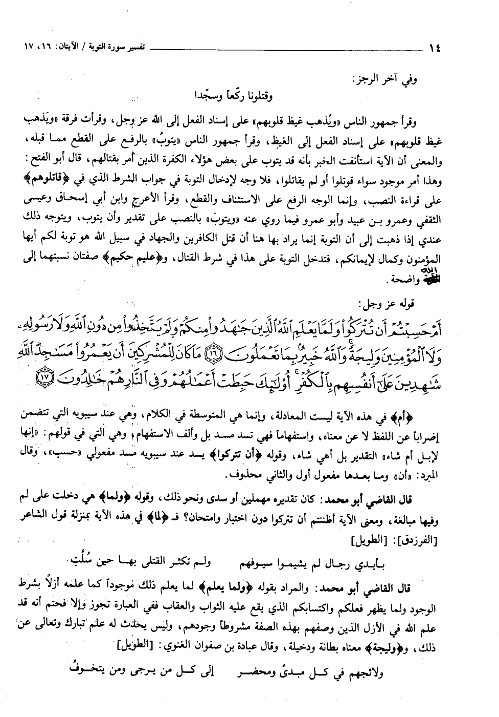 أَمْ حَسِبْتُمْ أَنْ تُتْرَكُوا وَلَمَّا يَعْلَمِ اللَّهُ الَّذِينَ جاهَدُوا مِنْكُمْ وَلَمْ يَتَّخِذُوا مِنْ دُونِ اللَّهِ وَلا رَسُولِهِ وَلا الْمُؤْمِنِينَ وَلِيجَةً وَاللَّهُ خَبِيرٌ بِما تَعْمَلُونَ (١٦) ما كانَ لِلْمُشْرِكِينَ أَنْ يَعْمُرُوا مَساجِدَ اللَّهِ شاهِدِينَ عَلى أَنْفُسِهِمْ بِالْكُفْرِ أُولئِكَ حَبِطَتْ أَعْمالُهُمْ وَفِي النَّارِ هُمْ خالِدُونَ (١٧)