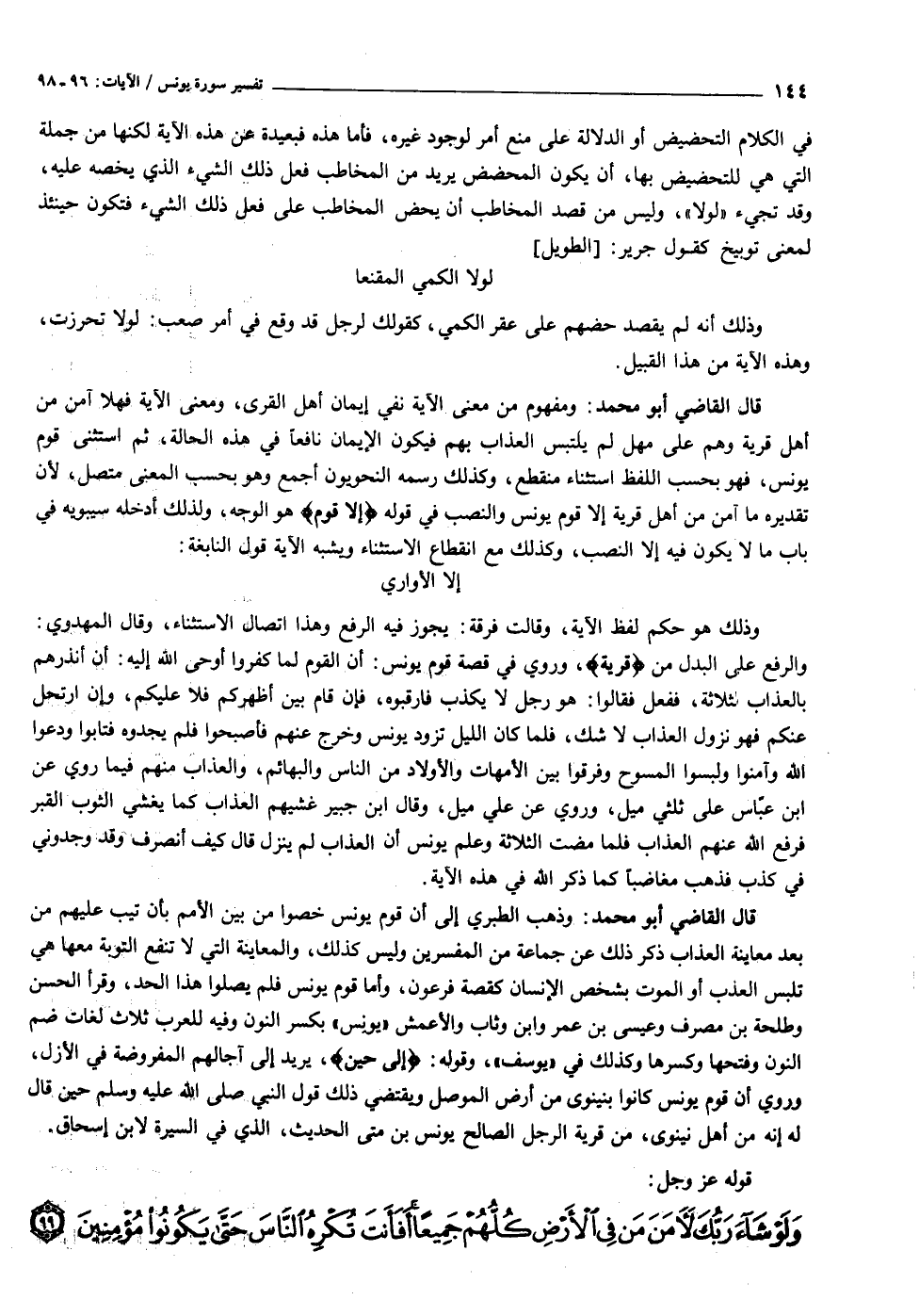 قال القاضي أبو محمد: ومفهوم من معنى الآية نفي إيمان أهل القرى، ومعنى الآية فهلا آمن من أهل قرية وهم على مهل لم يلتبس العذاب بهم فيكون الإيمان نافعا في هذه الحالة، ثم استثنى قوم يونس، فهو بحسب اللفظ استثناء منقطع، وكذلك رسمه النحويون أجمع وهو بحسب المعنى متصل، لأن تقديره ما آمن من أهل قرية إلا قوم يونس والنصب في قوله إِلَّا قَوْمَ هو الوجه، ولذلك أدخله سيبويه في باب ما لا يكون فيه إلا النصب، وكذلك مع انقطاع الاستثناء ويشبه الآية قول النابغة: