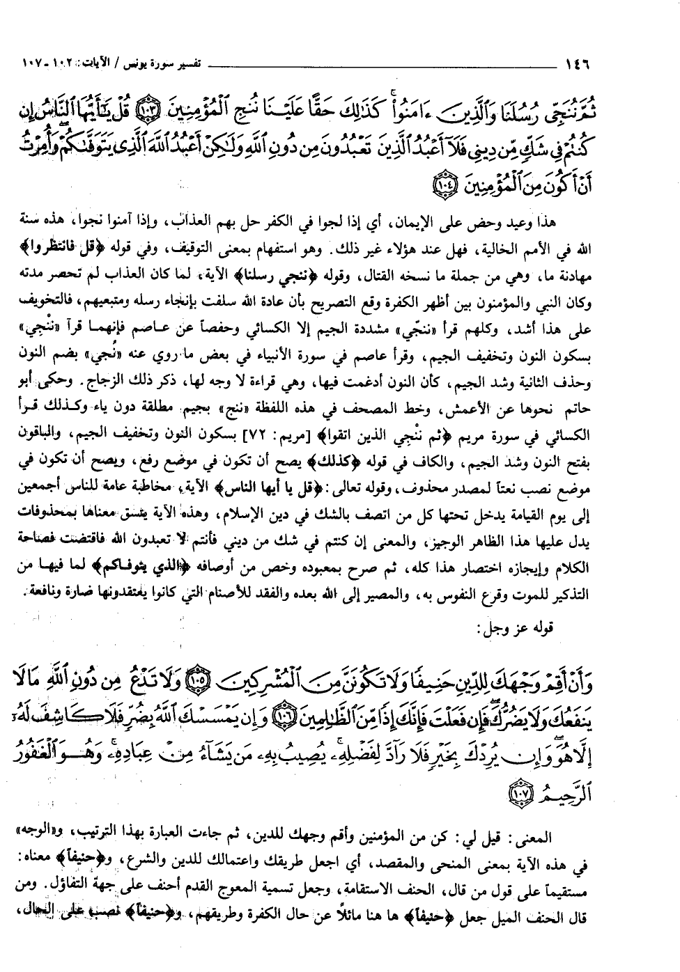وَأَنْ أَقِمْ وَجْهَكَ لِلدِّينِ حَنِيفاً وَلا تَكُونَنَّ مِنَ الْمُشْرِكِينَ (١٠٥) وَلا تَدْعُ مِنْ دُونِ اللَّهِ ما لا يَنْفَعُكَ وَلا يَضُرُّكَ فَإِنْ فَعَلْتَ فَإِنَّكَ إِذاً مِنَ الظَّالِمِينَ (١٠٦) وَإِنْ يَمْسَسْكَ اللَّهُ بِضُرٍّ فَلا كاشِفَ لَهُ إِلاَّ هُوَ وَإِنْ يُرِدْكَ بِخَيْرٍ فَلا رَادَّ لِفَضْلِهِ يُصِيبُ بِهِ مَنْ يَشاءُ مِنْ عِبادِهِ وَهُوَ الْغَفُورُ الرَّحِيمُ (١٠٧)