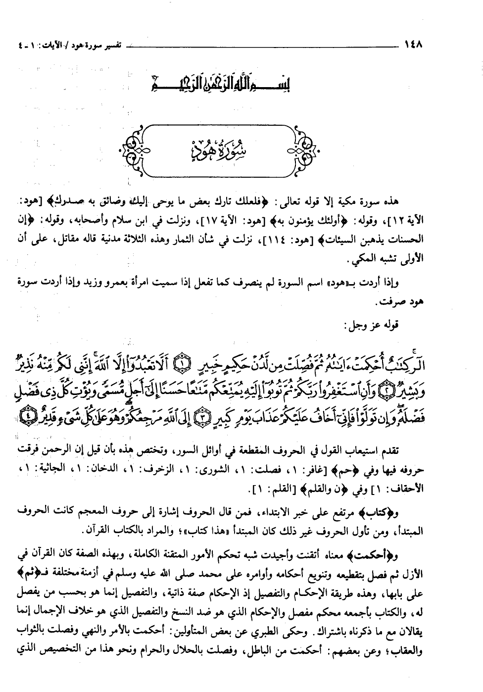 الر كِتابٌ أُحْكِمَتْ آياتُهُ ثُمَّ فُصِّلَتْ مِنْ لَدُنْ حَكِيمٍ خَبِيرٍ (١) أَلاَّ تَعْبُدُوا إِلاَّ اللَّهَ إِنَّنِي لَكُمْ مِنْهُ نَذِيرٌ وَبَشِيرٌ (٢) وَأَنِ اسْتَغْفِرُوا رَبَّكُمْ ثُمَّ تُوبُوا إِلَيْهِ يُمَتِّعْكُمْ مَتاعاً حَسَناً إِلى أَجَلٍ مُسَمًّى وَيُؤْتِ كُلَّ ذِي فَضْلٍ فَضْلَهُ وَإِنْ تَوَلَّوْا فَإِنِّي أَخافُ عَلَيْكُمْ عَذابَ يَوْمٍ كَبِيرٍ (٣) إِلَى اللَّهِ مَرْجِعُكُمْ وَهُوَ عَلى كُلِّ شَيْءٍ قَدِيرٌ (٤)