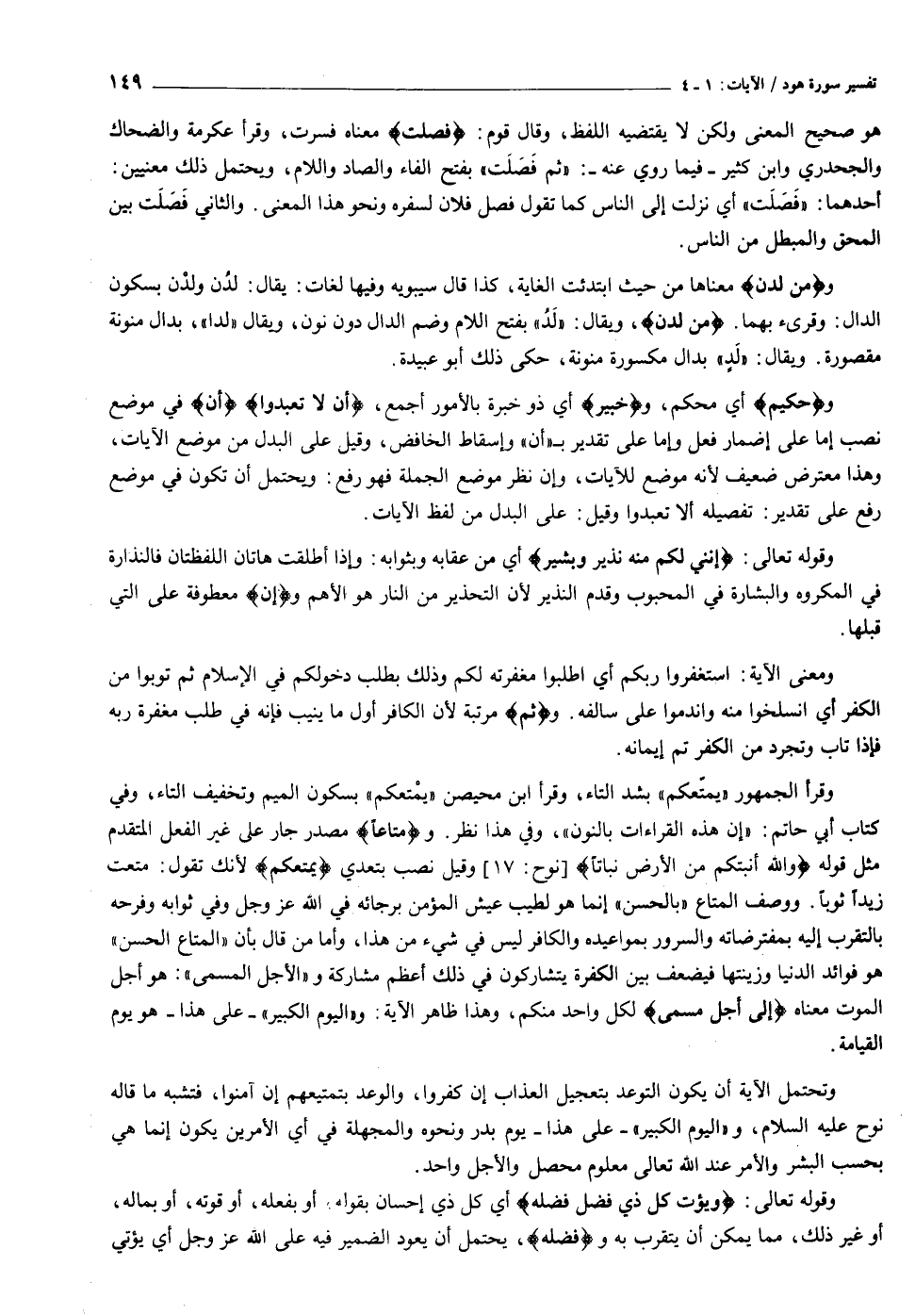 وحَكِيمٍ أي محكم، وخَبِيرٍ أي ذو خبرة بالأمور أجمع، أَلَّا تَعْبُدُوا أن في موضع نصب إما على إضمار فعل وإما على تقدير ب «أن» وإسقاط الخافض، وقيل على البدل من موضع الآيات، وهذا معترض ضعيف لأنه موضع للآيات، وإن نظر موضع الجملة فهو رفع: ويحتمل أن تكون في موضع رفع على تقدير: تفصيله ألا تعبدوا وقيل: على البدل من لفظ الآيات.